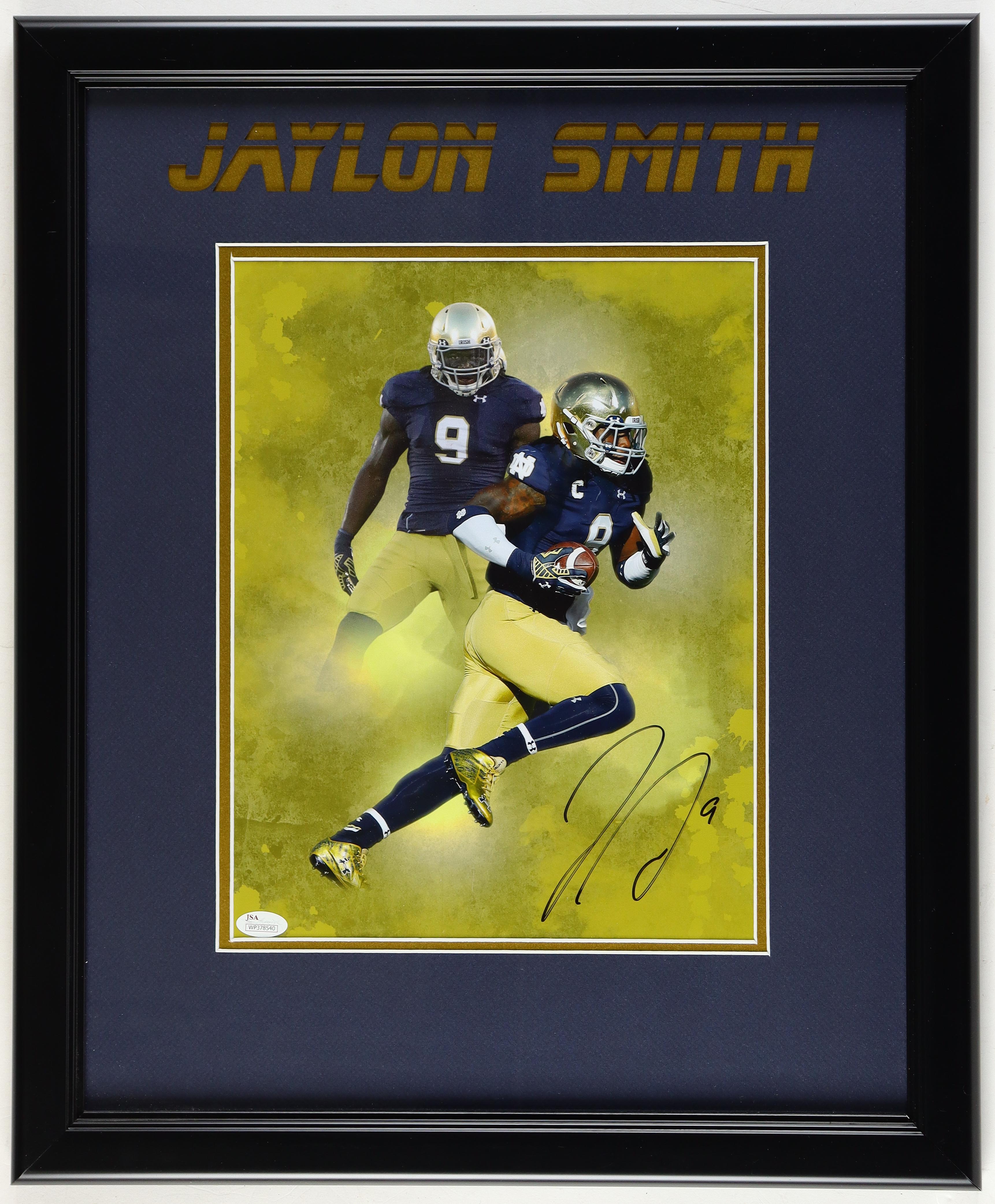 Custom frame measures 19" x 22" in size. Features a photo that has been hand-signed by Jaylon Smith (Notre Dame Fighting Irish).