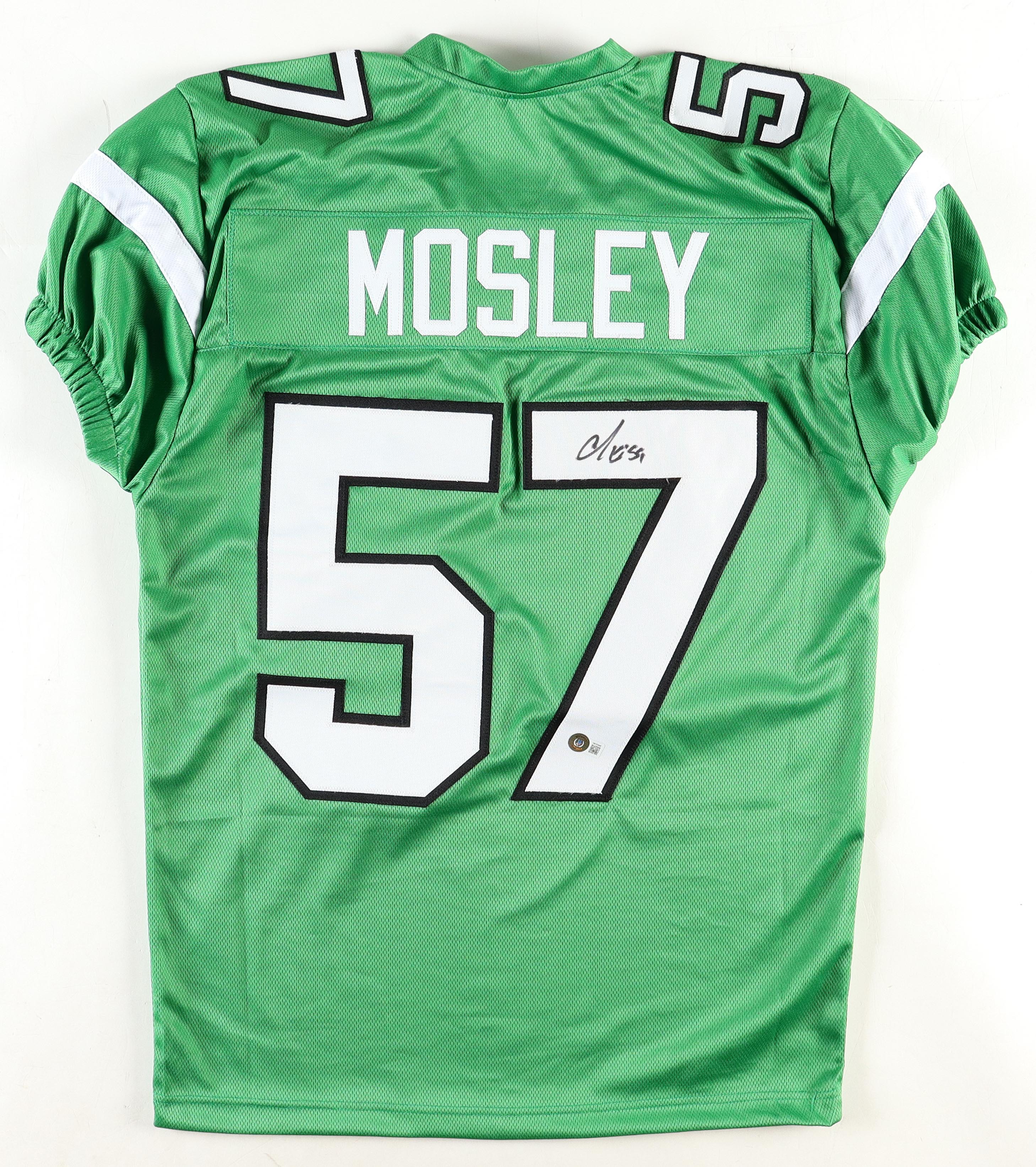 Custom jersey with everything sewn on, size XL. Hand-signed by C. J. Mosley.