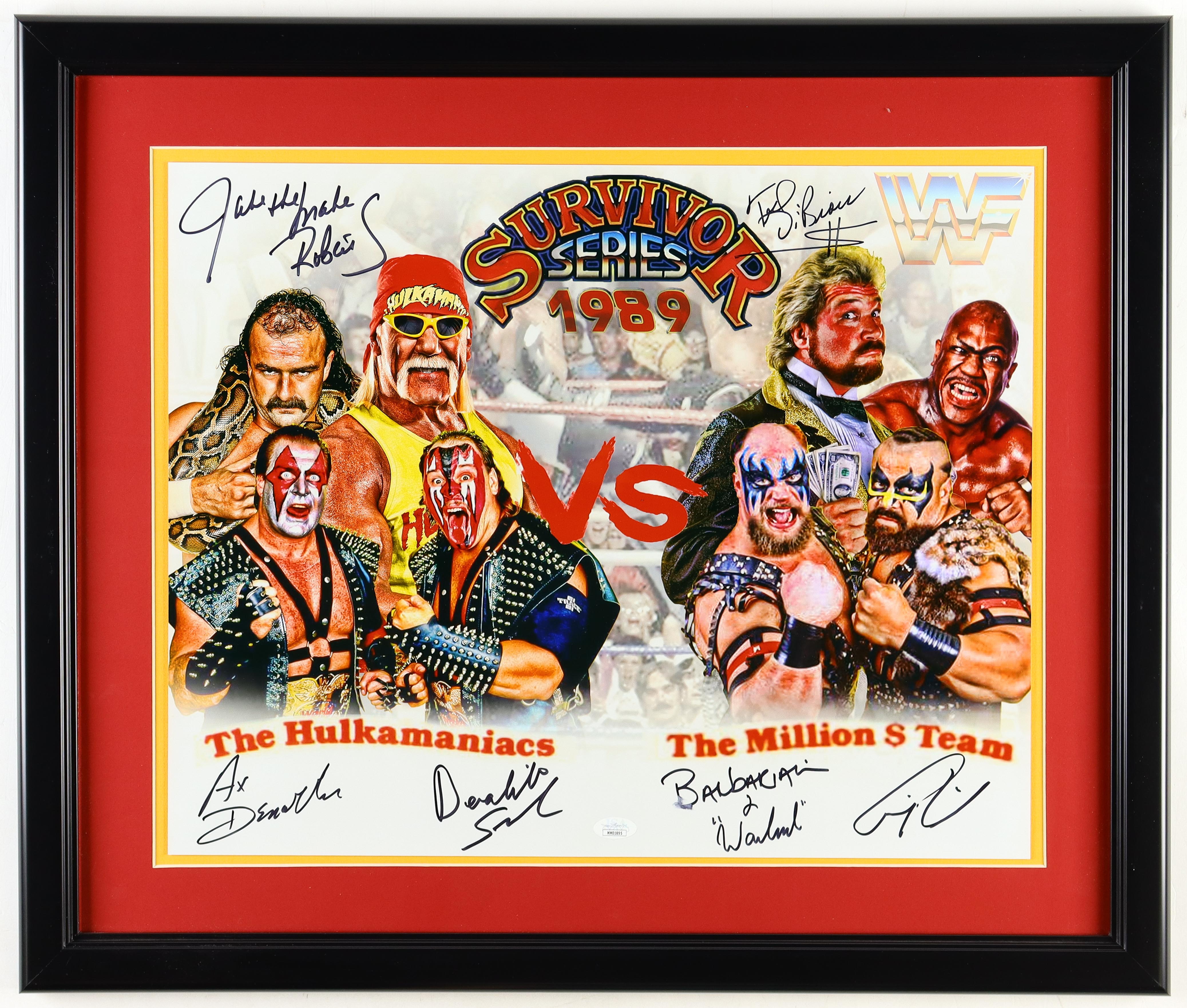 Survivor Series 1989 Wrestlers Custom Framed Photo Signed by (7) with Jake The Snake Roberts, Ted Dibiase, Tiny "Zeus" Lister, Axe Demolition (JSA)