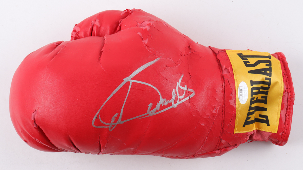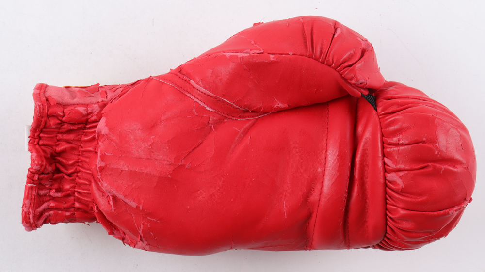 Everlast boxing glove has been hand-signed by Canelo Alvarez. Please note, the glove is damaged and is peeling.