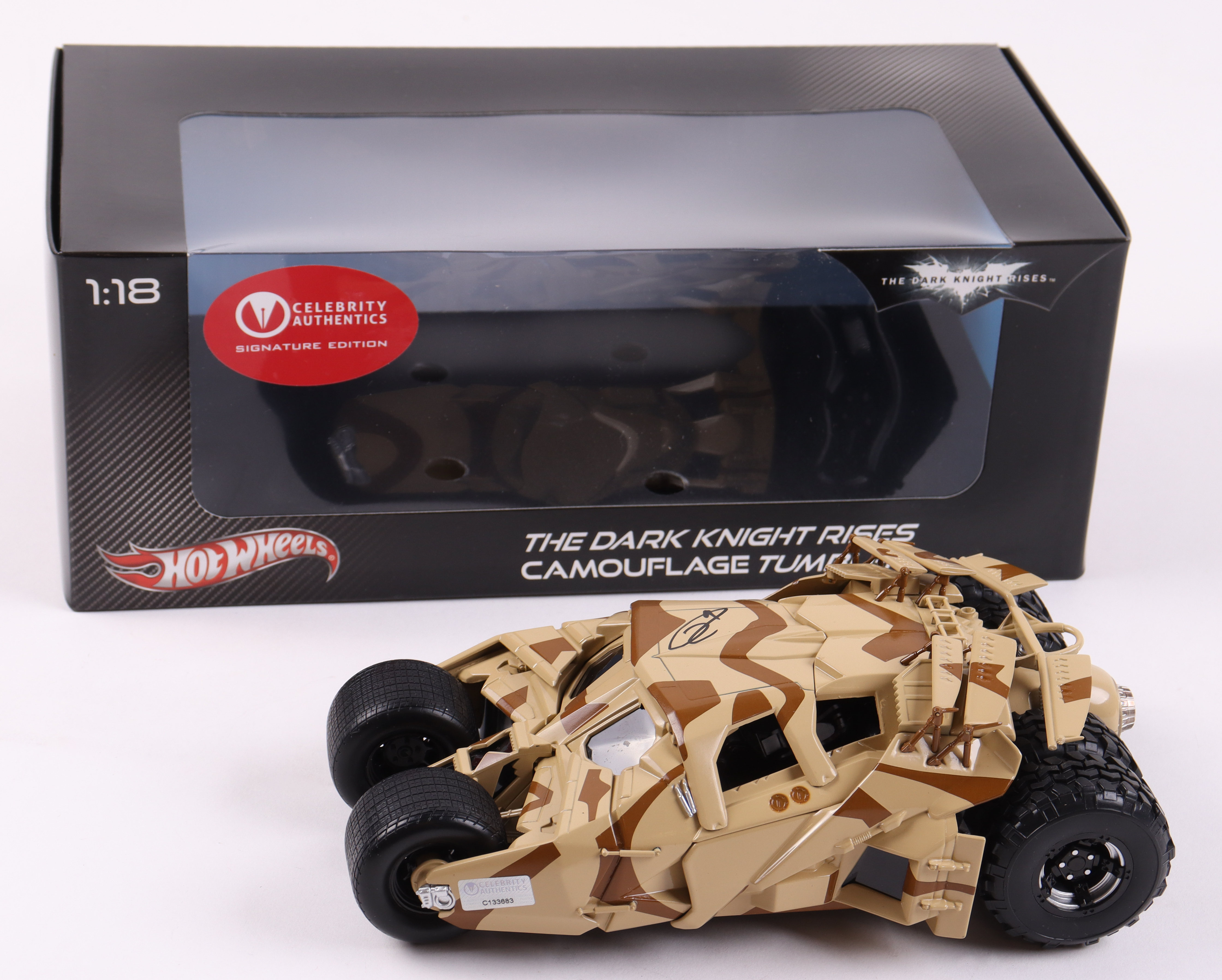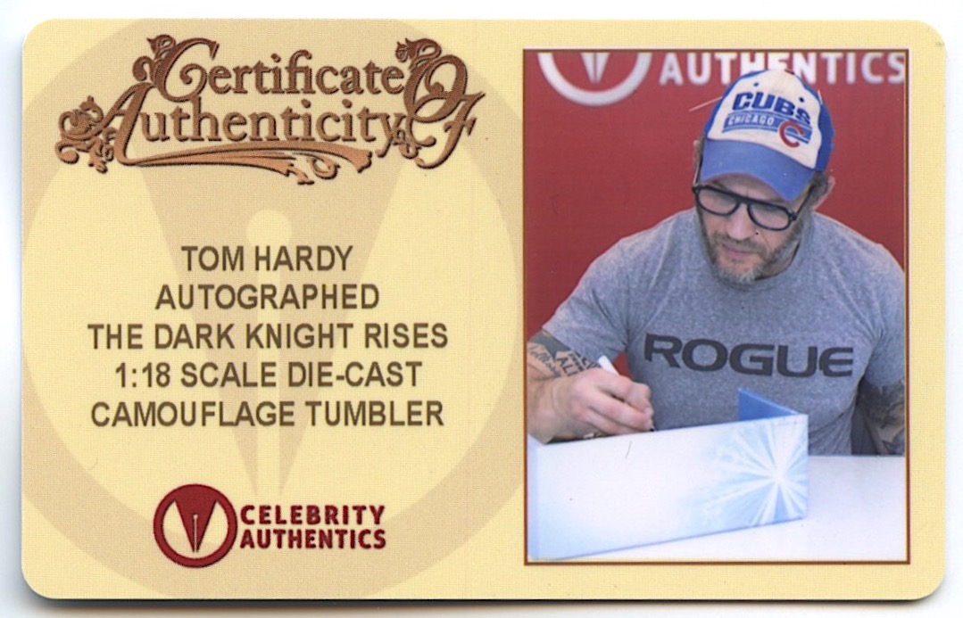 This 2012 The Dark Knight Rises 1:18 Scale Diecast Batmobile Camouflage Tumbler has been personally autographed by Bane himself, Tom Hardy during his signing with Celebrity Authentics.