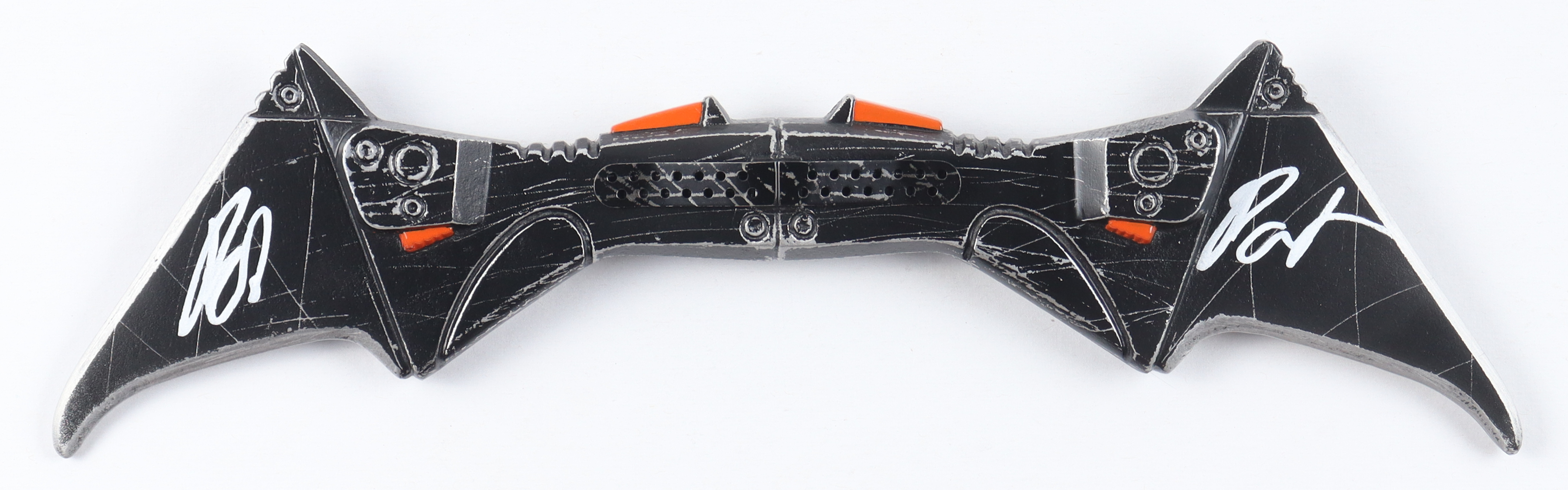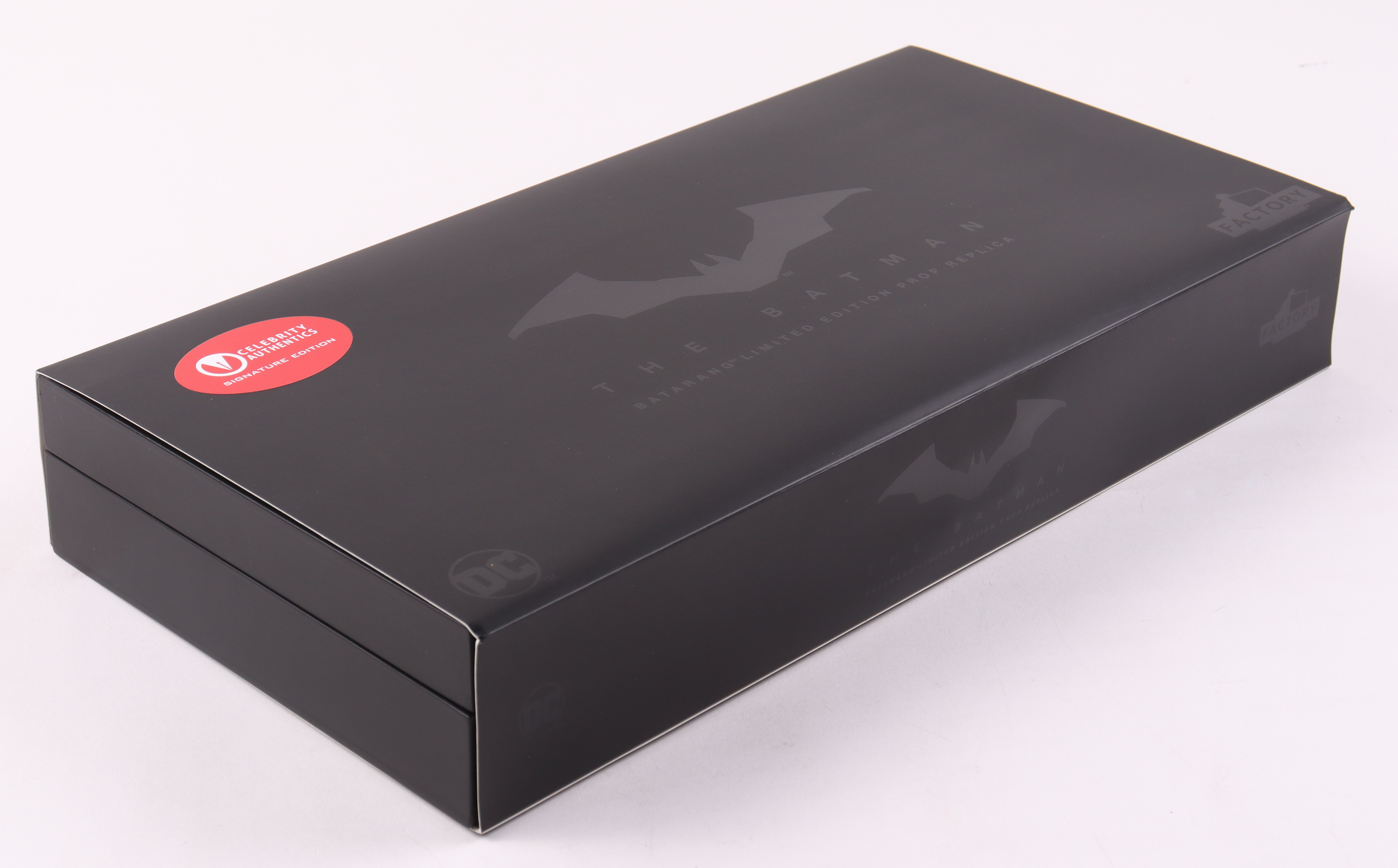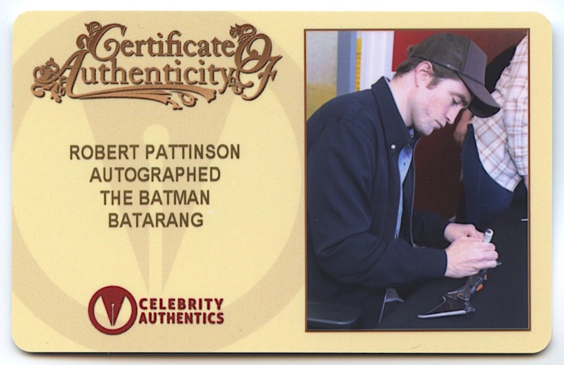 Ships affixed with Celebrity Authentics serial-numbered Authentication hologram and includes Celebrity Authentics Certificate of Authenticity featuring picture of Robert signing Batarang.