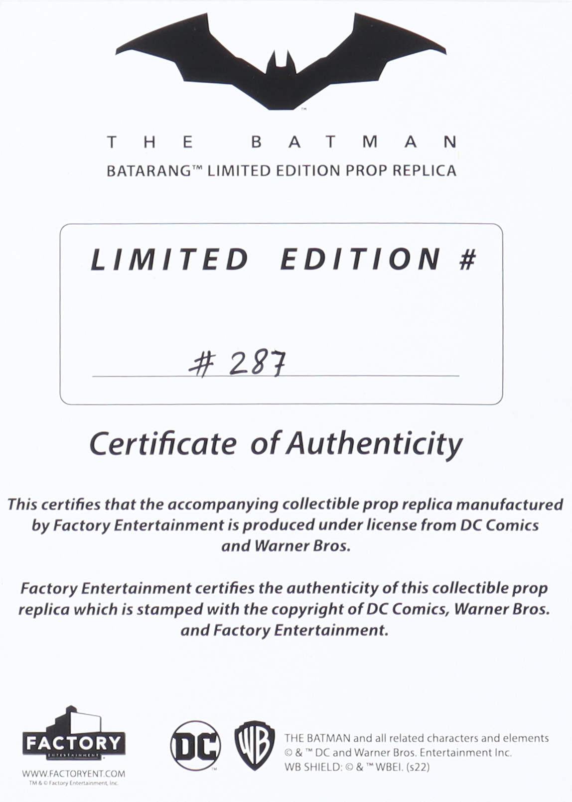 This Factory Entertainment 2022 The Batman Batarang Limited Edition Prop Replica has been personally autographed by Robert Pattinson during his exclusive signing with Celebrity Authentics!