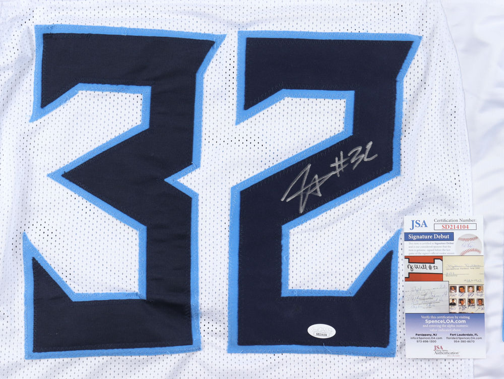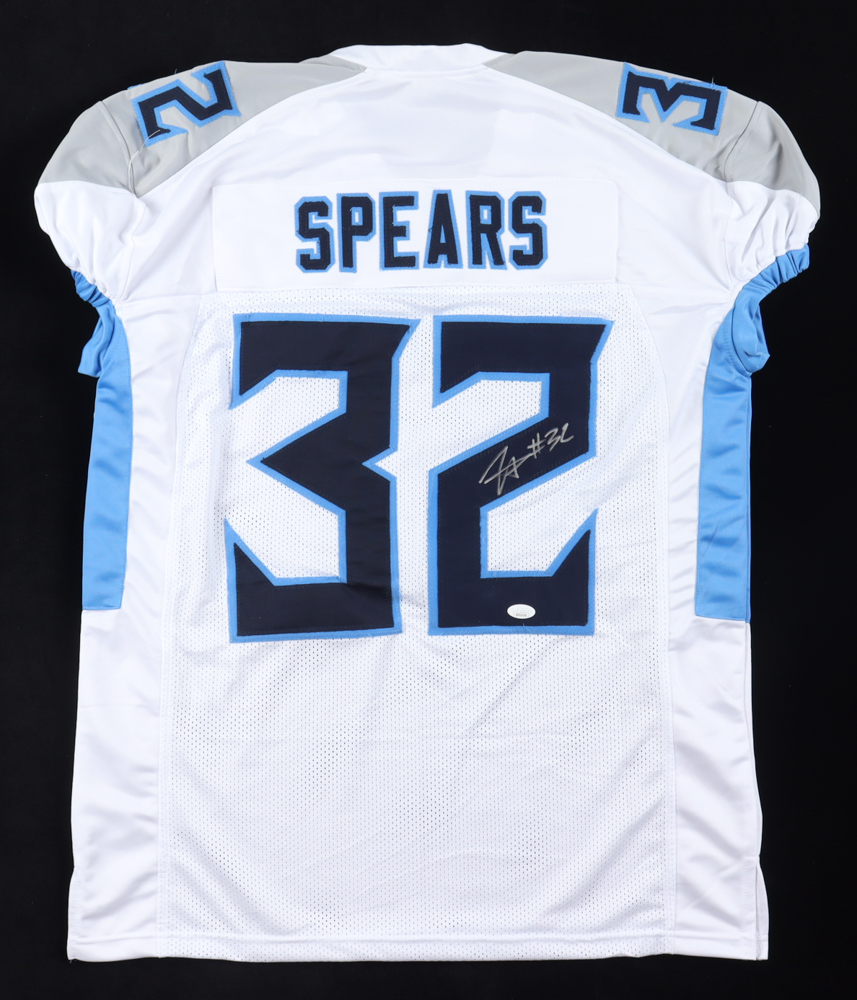 Custom jersey. Everything sewn on, size XL. Hand-signed by Tyjae Spears. Please note, there is a stain on the reverse number.