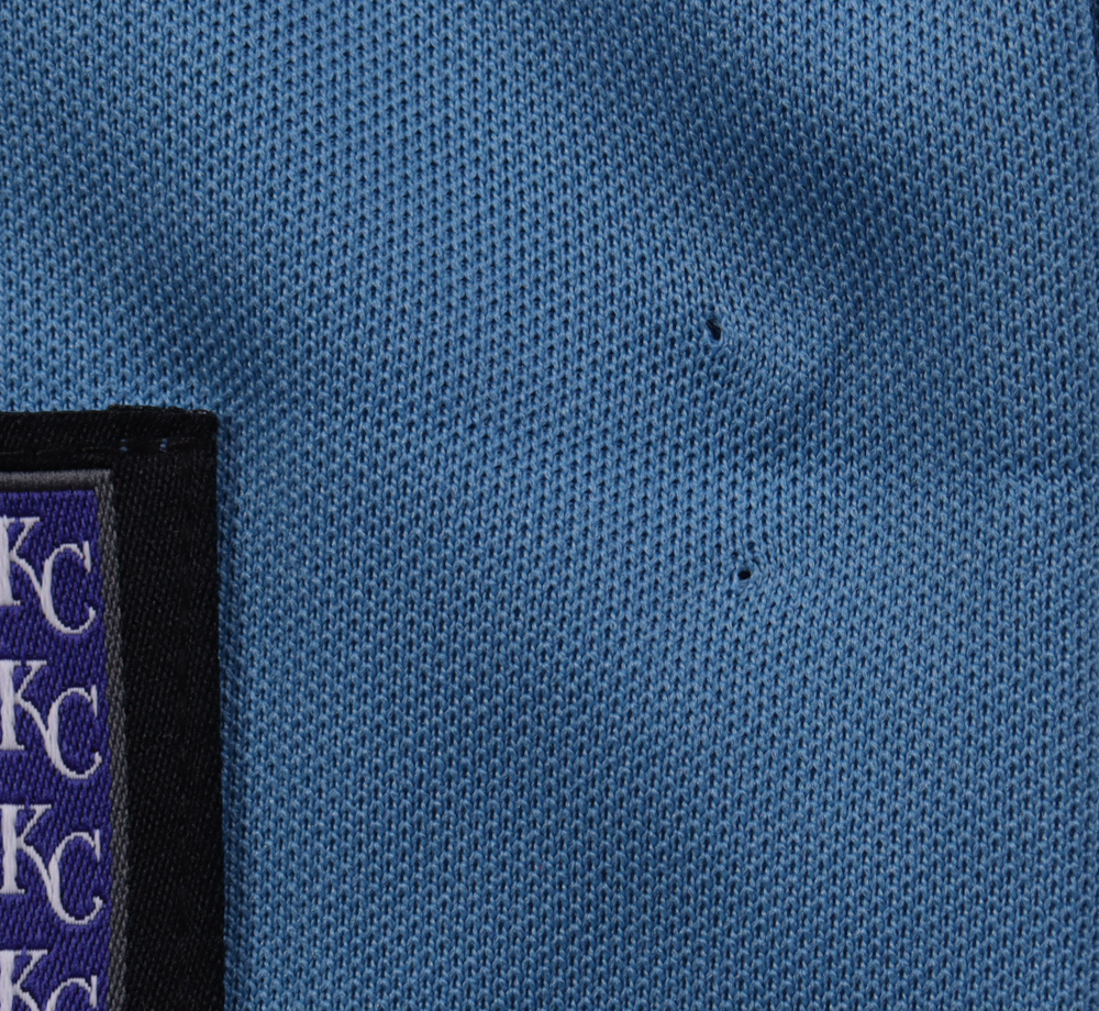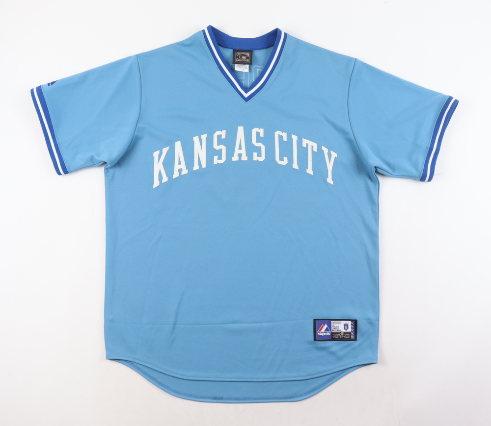 Majestic jersey. Everything is sewn on, size L. Hand-signed and inscribed by George Brett (Kansas City Royals, HOF). Please note, there is damage to the left and right sides of the jersey.