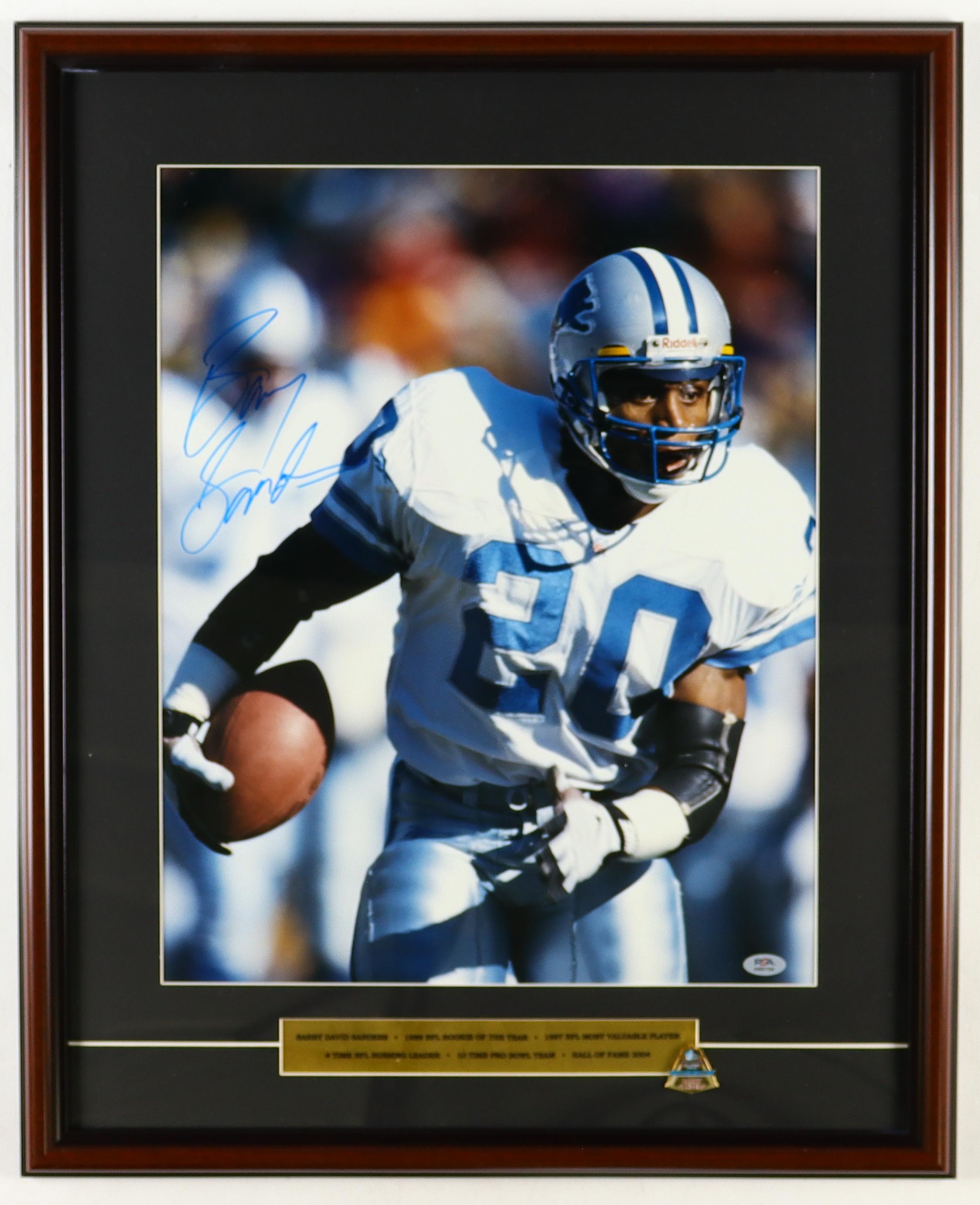 Barry Sanders Signed Lions Custom Framed Photo Display With Official 2004 Hall Of Fame Induction Pin (PSA)