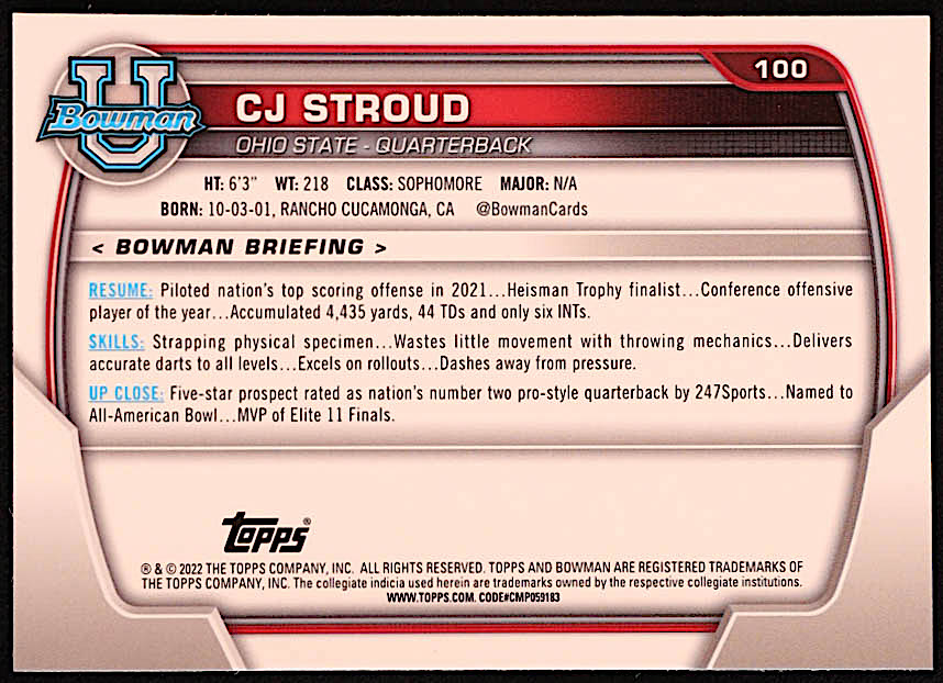 CJ Stroud 2022 Bowman Chrome University #100 RC
