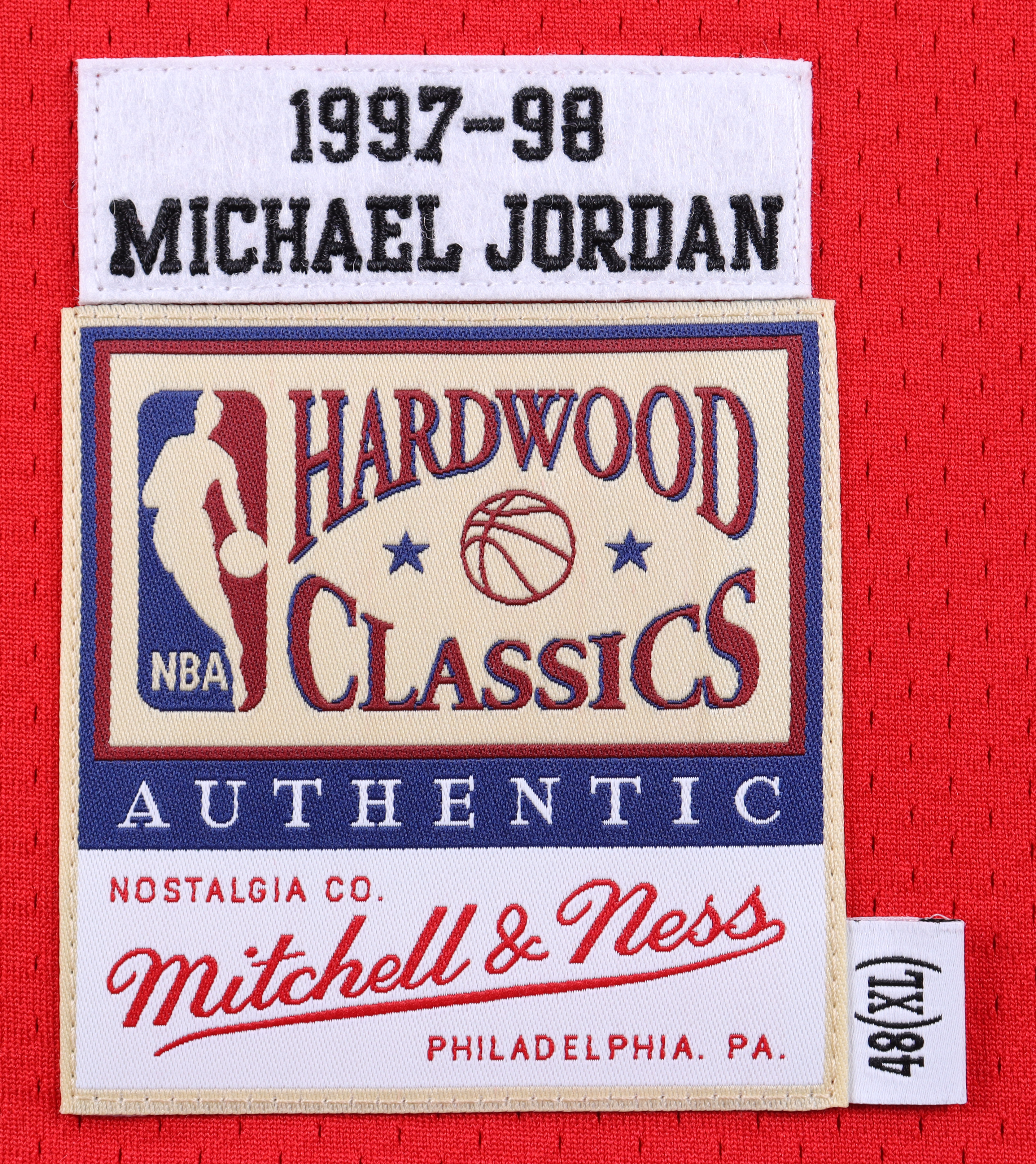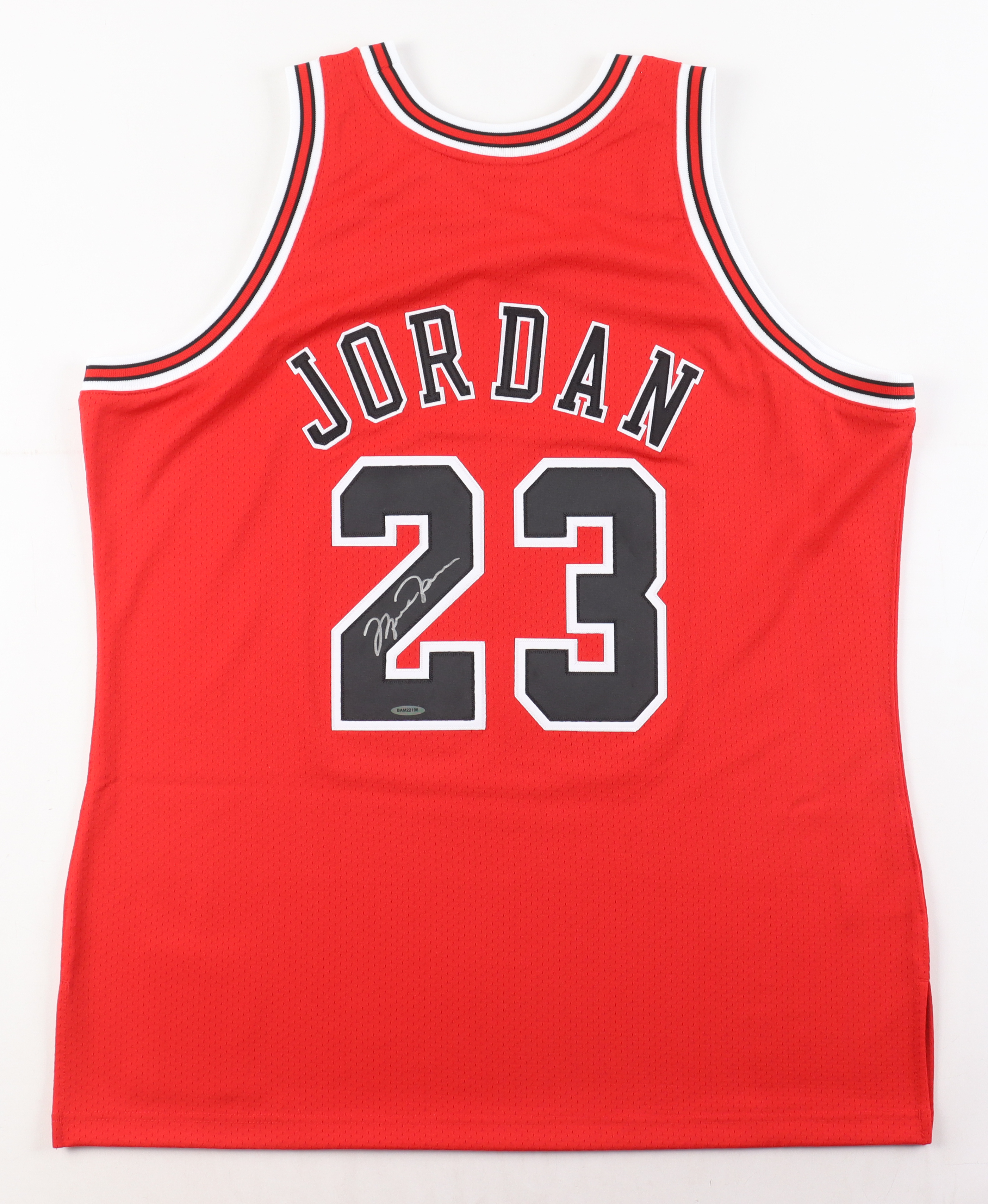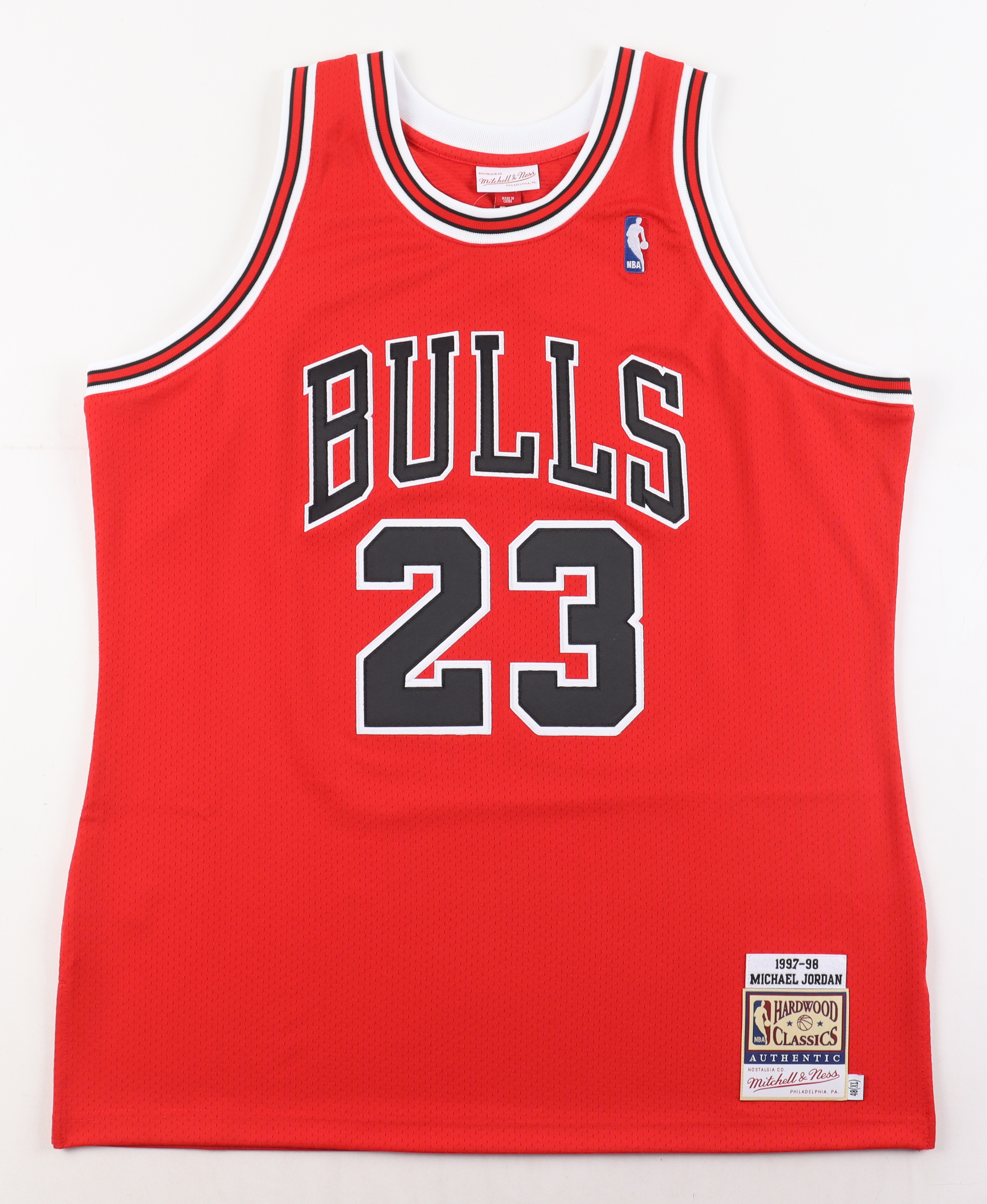 Mitchell & Ness 1997-98 style authentic jersey. Everything is sewn on, size XL. Hand-signed by Michael Jordan (Chicago Bulls, HOF).