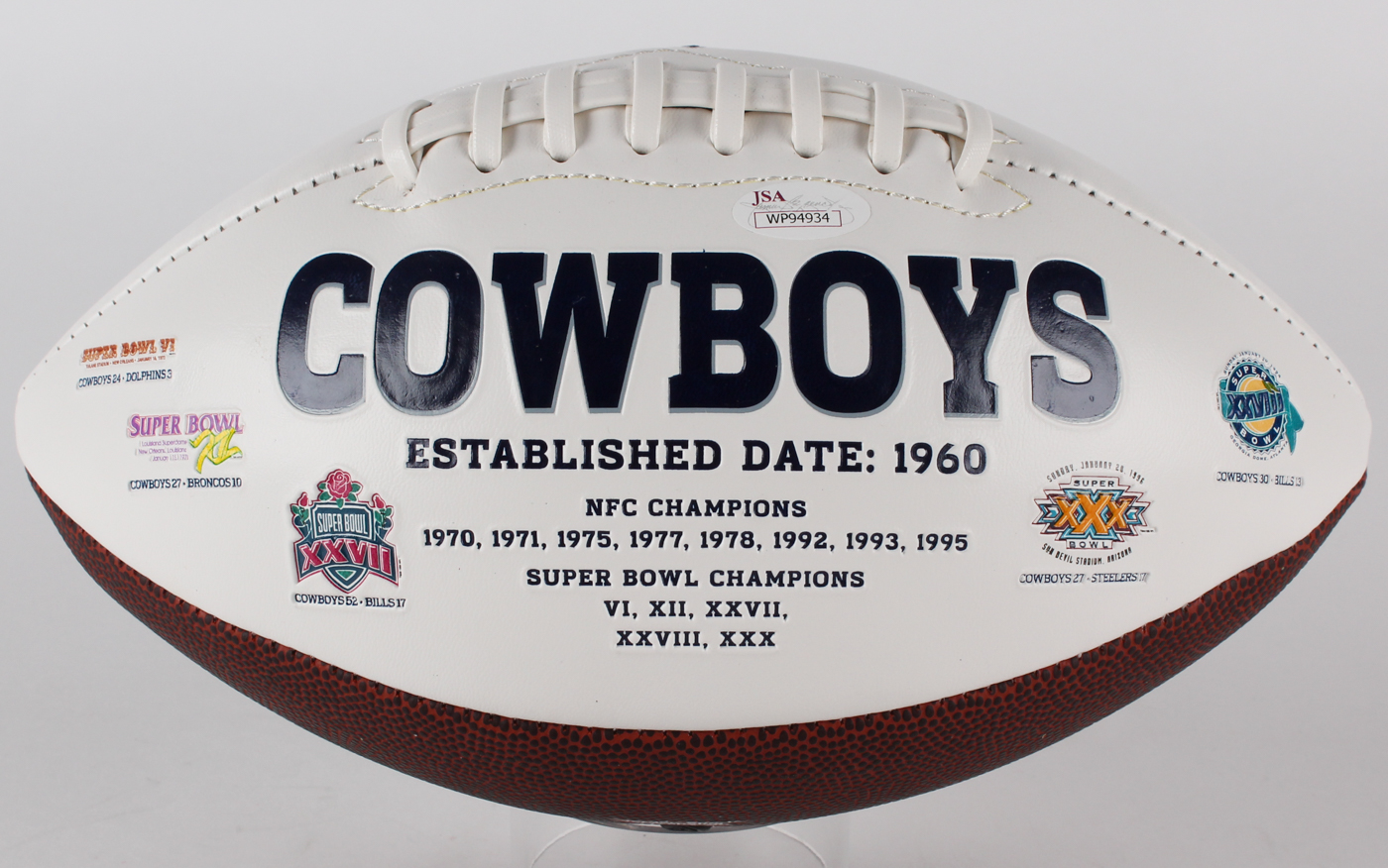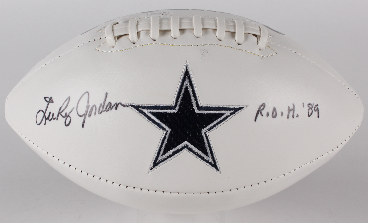 Full-size Dallas Cowboys logo football. Hand-signed and inscribed in black felt-tip pen by Lee Roy Jordan (Cowboys). Please note, football is slightly deflated, holds air for display purposes only.