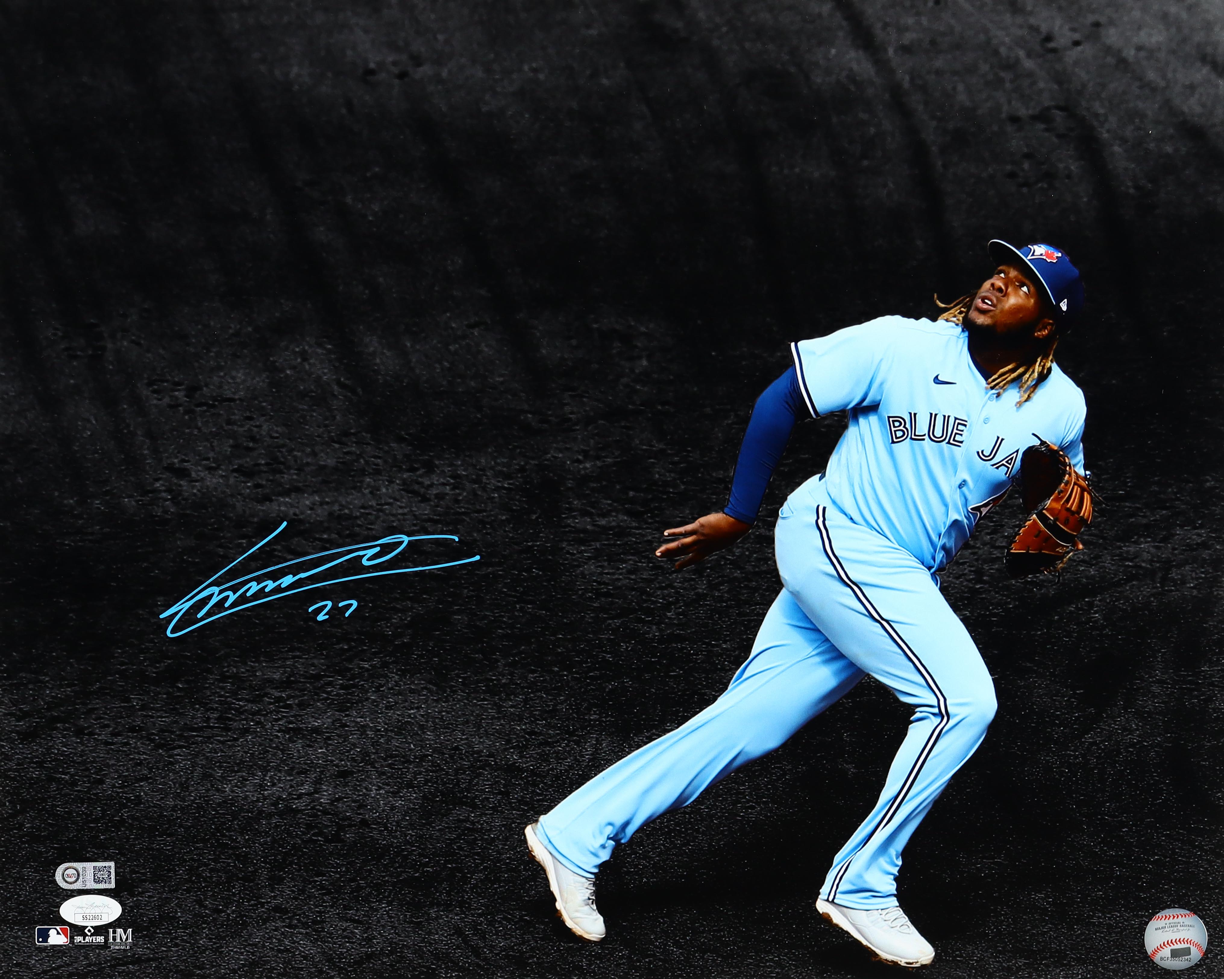 Photo measures 16" x 20" in size and has been hand-signed by Vladimir Guerrero Jr. (Toronto Blue Jays).