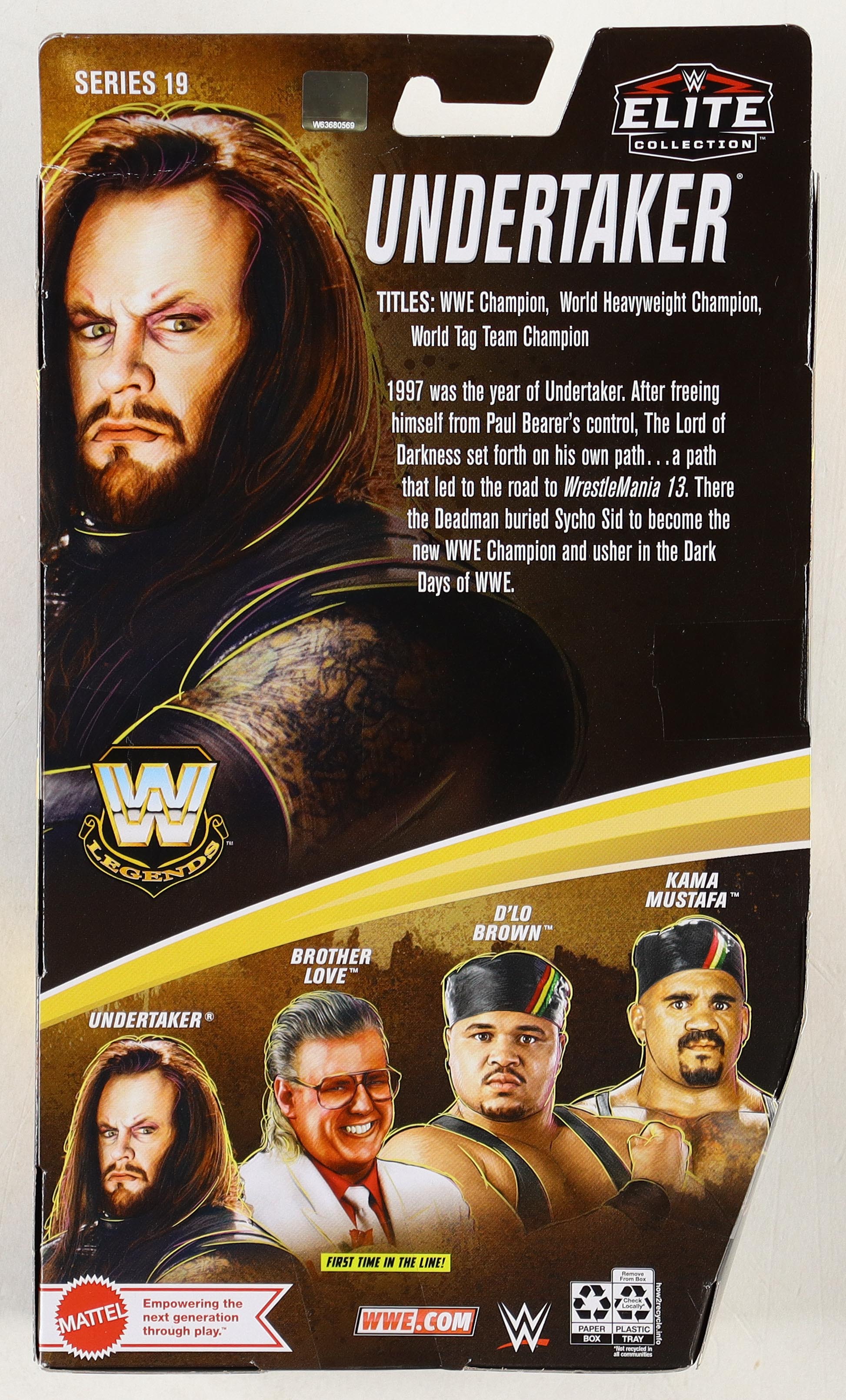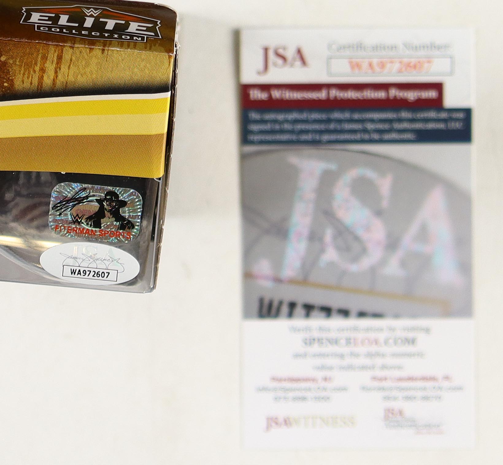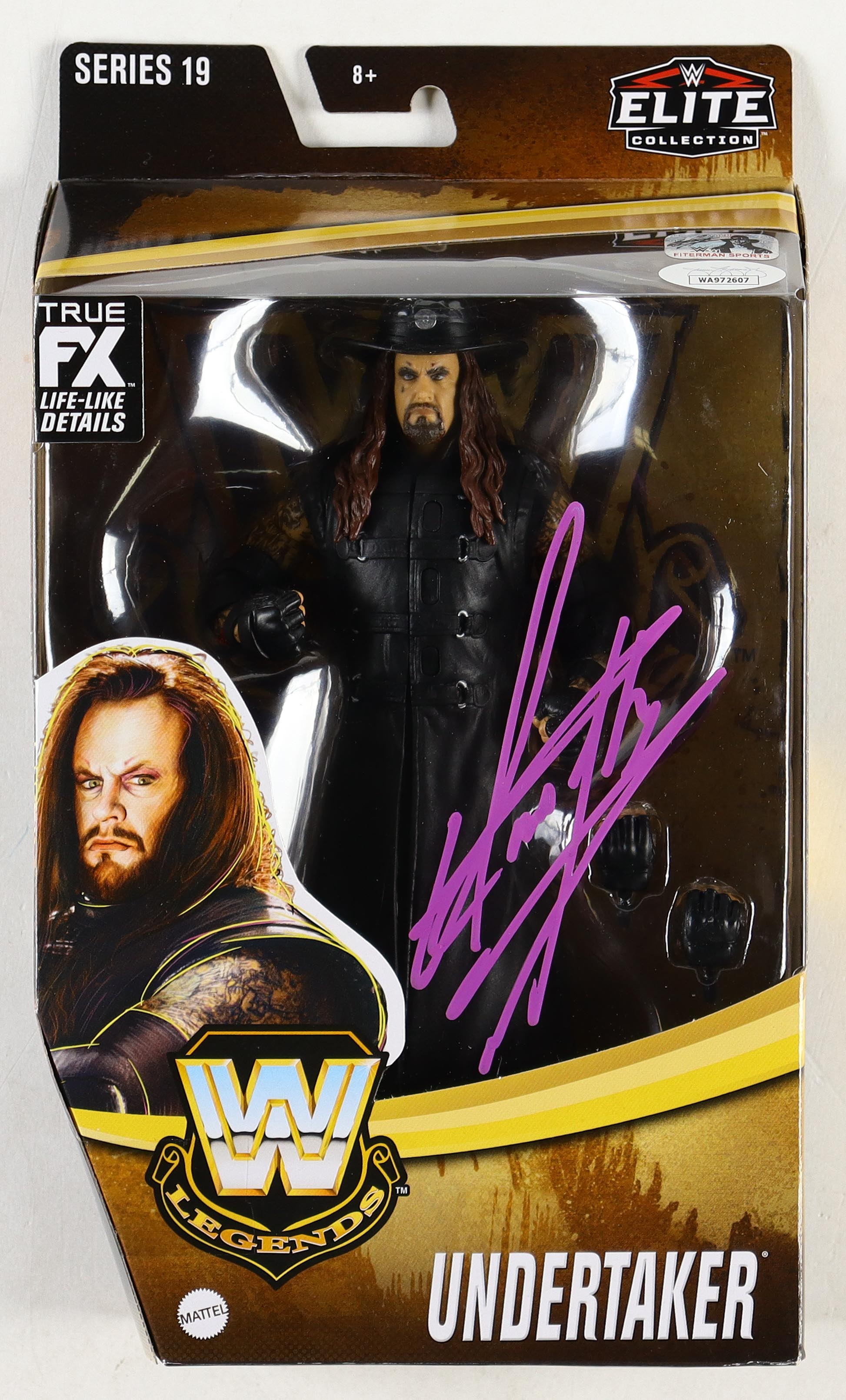 WWE Elite Collection Series 19 action figure measures approximately 7" in height. The packaging has been hand-signed by Undertaker (HOF).