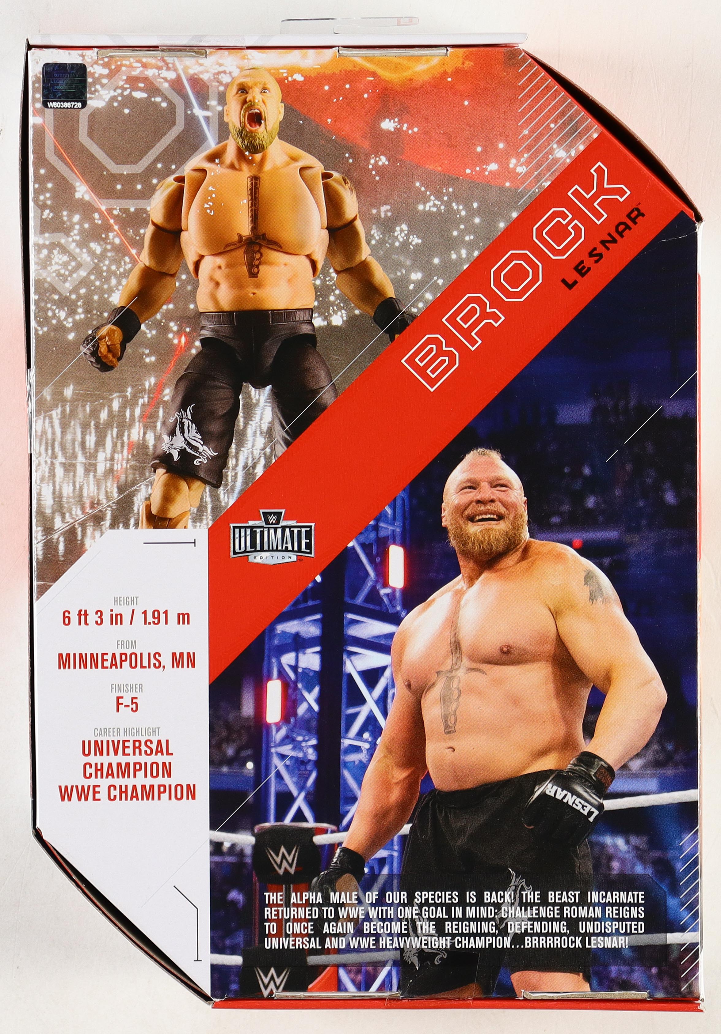 WWE Action Figure in original package. Action figure measures approximately 8" in height and has been hand-signed on the package by Brock Lesnar. Please note there are scratches in the signature, see photo for details.
