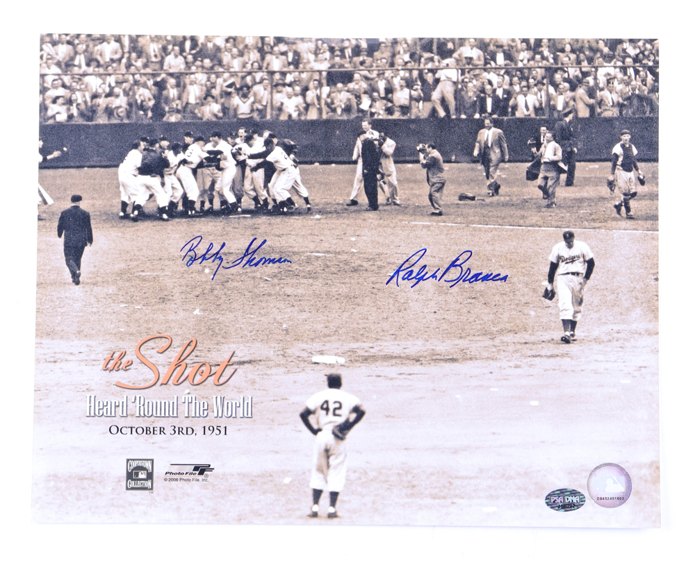 Photo measures 11" x 14" in size. Hand-signed by Ralph Branca (D. 2016, Brooklyn Dodgers) and Bobby Thomson (New York Giants).