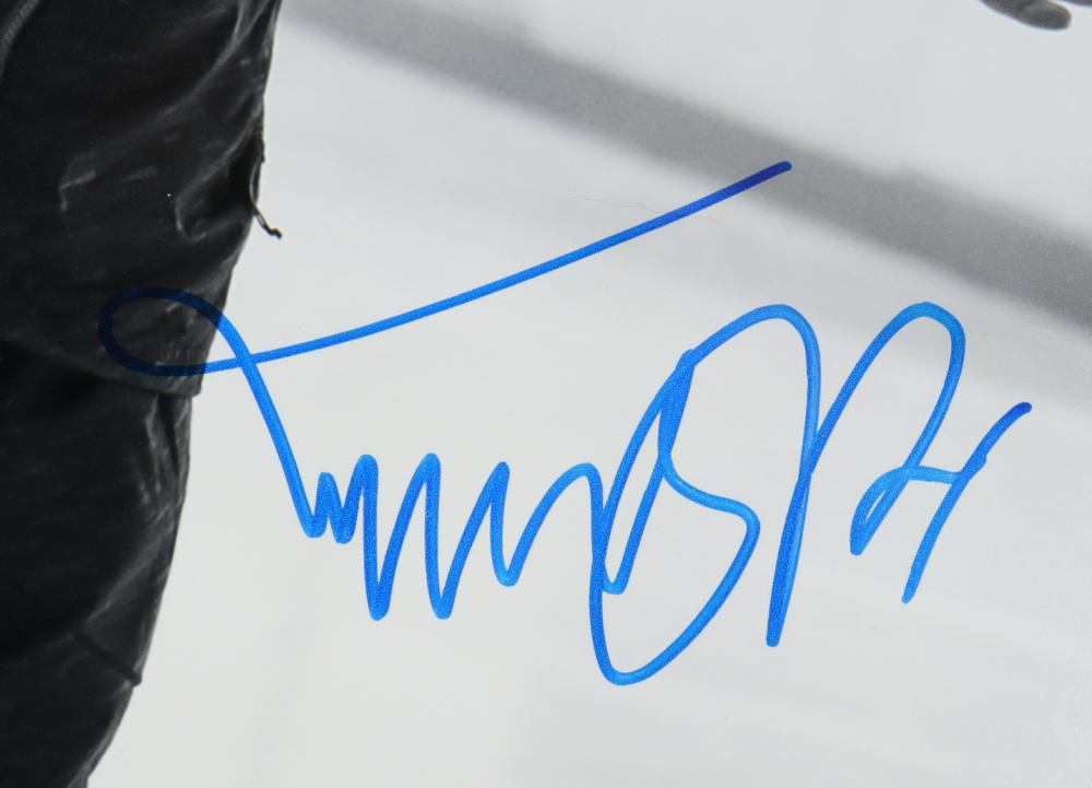 Photo measures 11" x 14" in size and has been hand-signed by Henrik Lundqvist (Goaltender, New York Rangers) and Michael J. Fox (Actor).