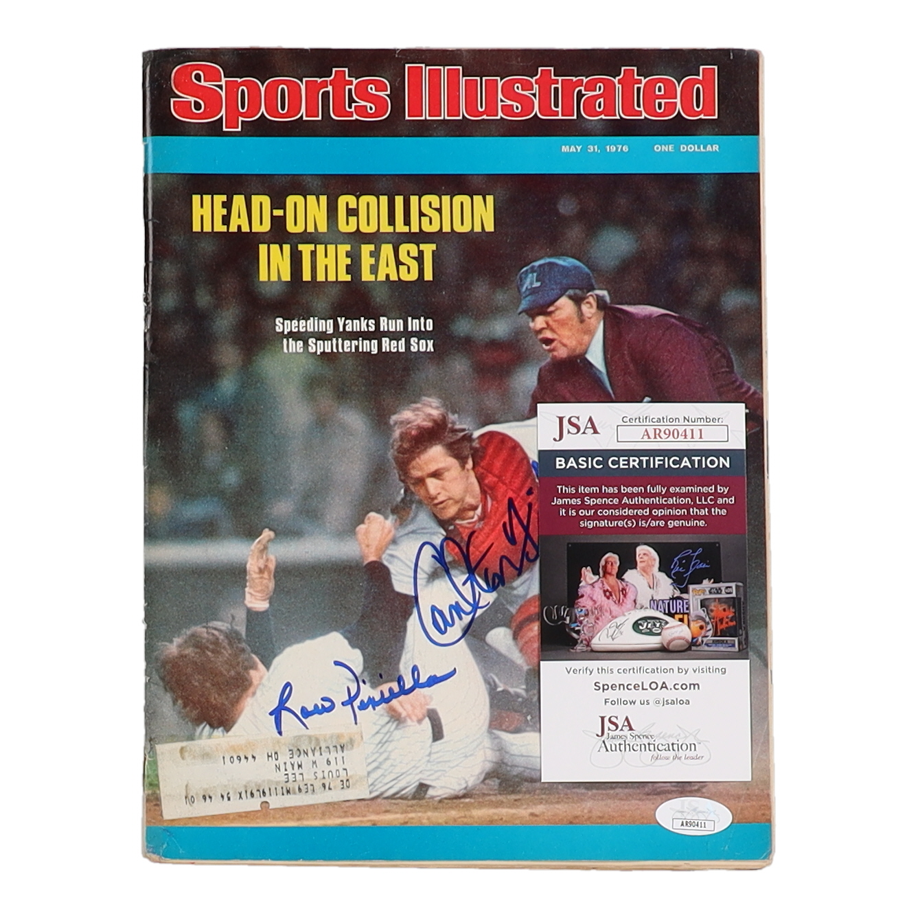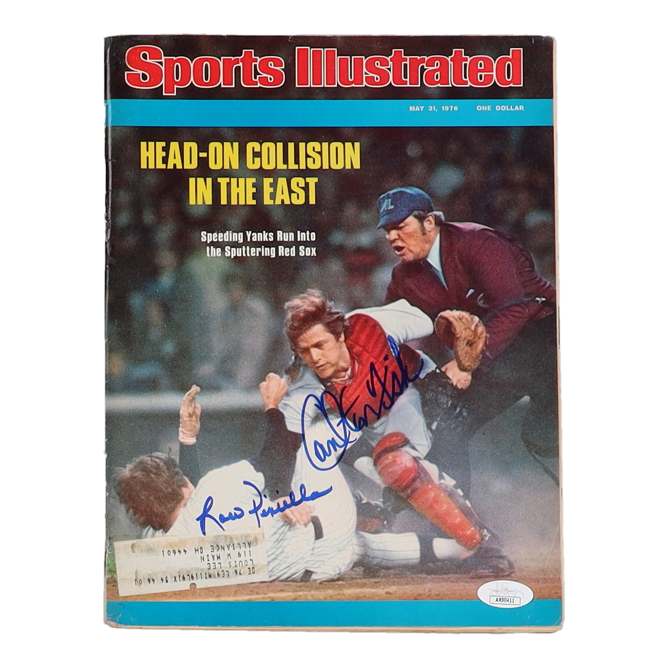 Magazine cover dated May 31, 1976 has been hand-signed by Carlton Fisk (Boston Red Sox, HOF) & Lou Pinella (New York Yankees). Please note, magazine shows signs of wear and creasing.