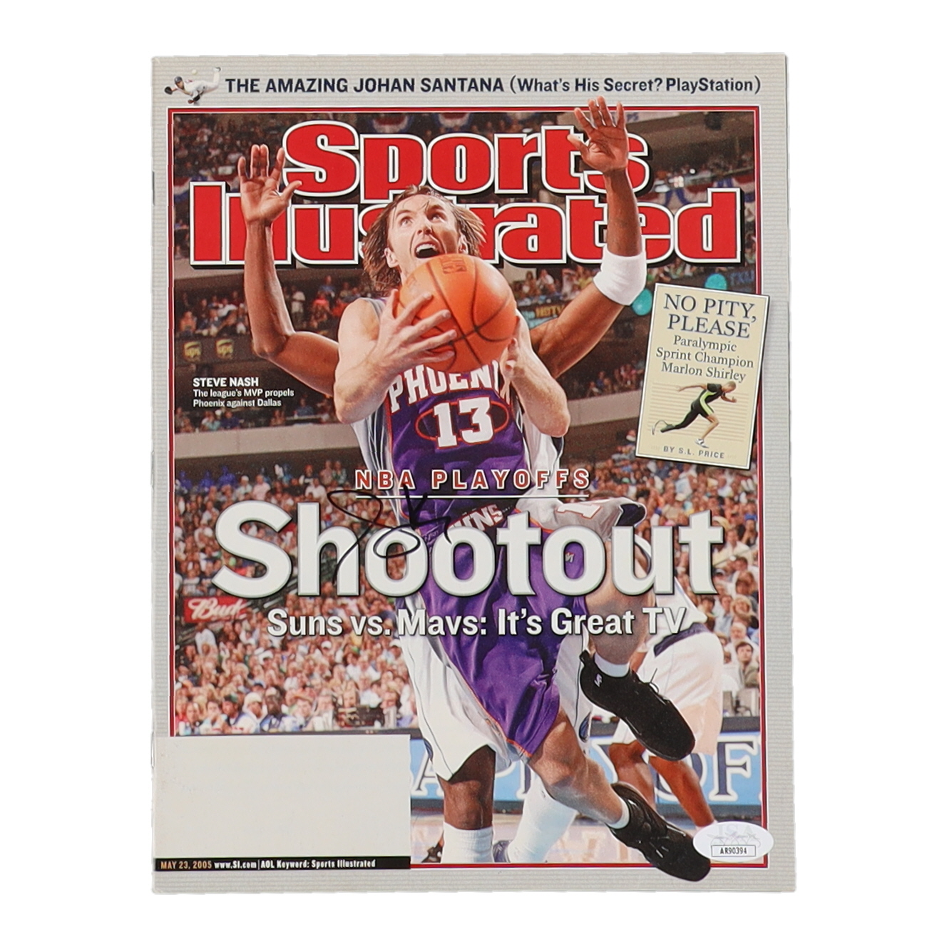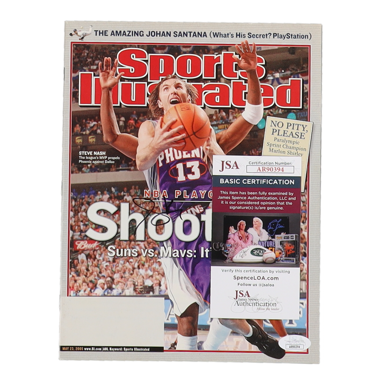Magazine cover dated May 23, 2005 has been hand-signed by Steve Nash (Phoenix Nash, HOF). Please note, magazine shows signs of wear and creasing.