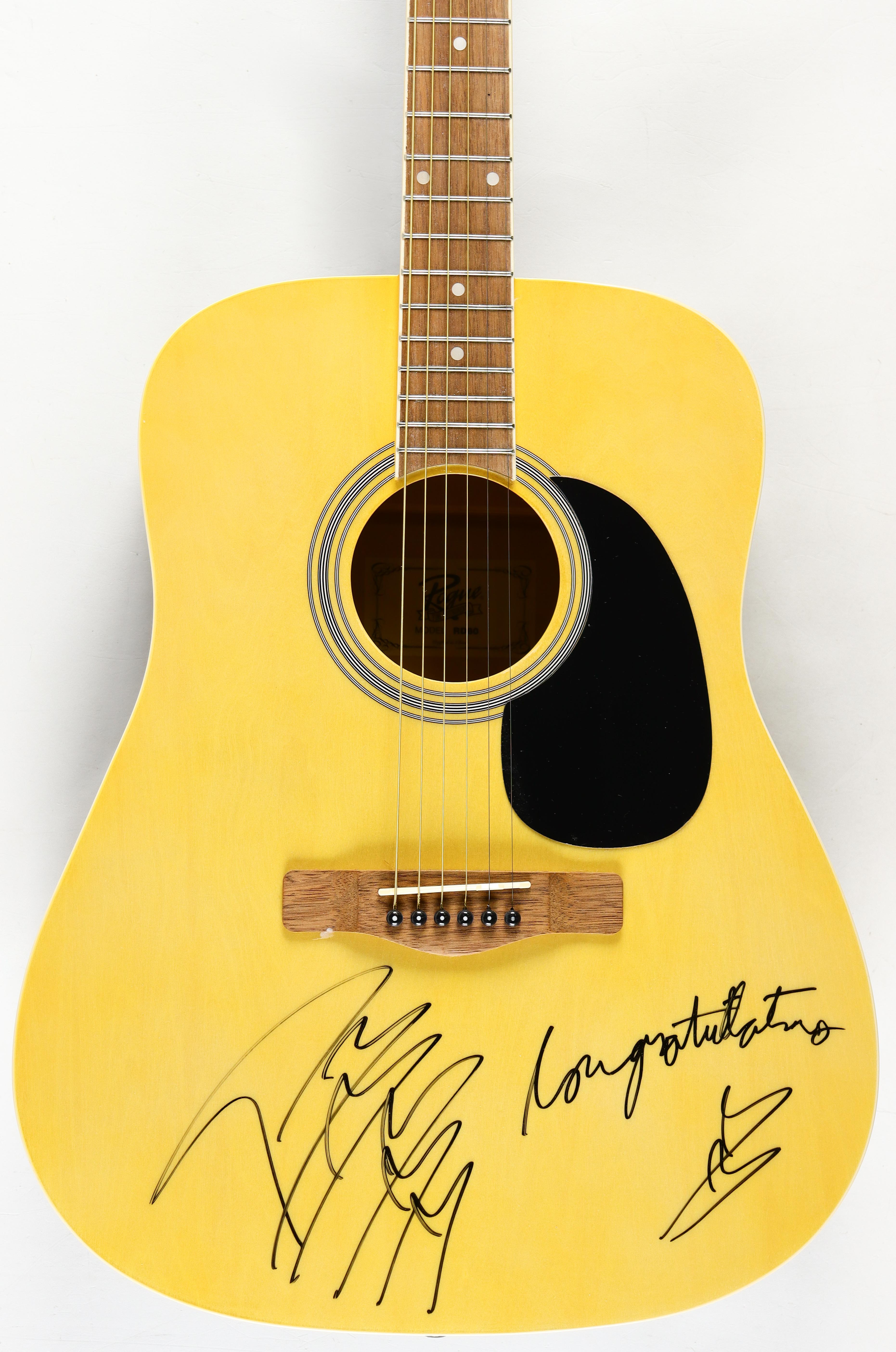 Rogue acoustic guitar measures approximately 38" in length and has been hand-signed and inscribed on the body of the guitar by Post Malone.