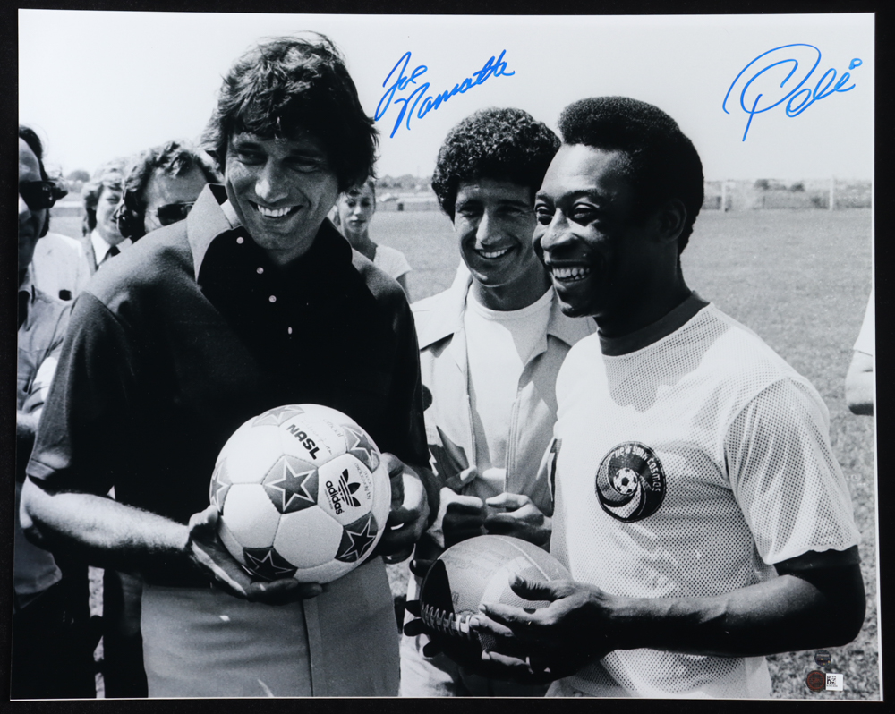 Photo measures 16" x 20" in size. Hand-signed by Pele (D. 2022, HOF) and Joe Namath (New York Jets, HOF).