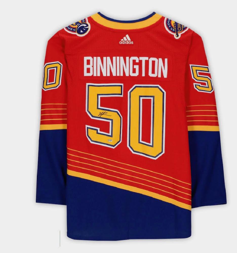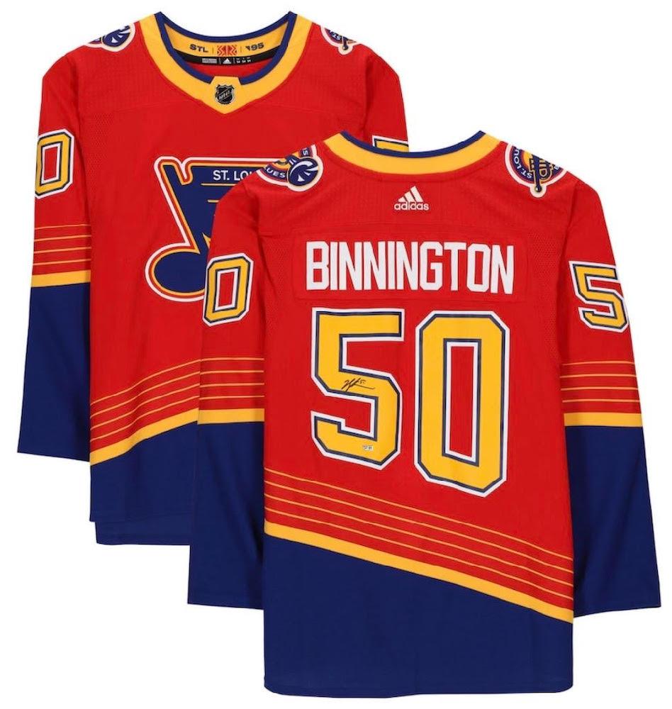 Adidas Reverse Retro jersey. Everything stitched on, size 48. Hand-signed by Jordan Binnington (St. Louis Blues).