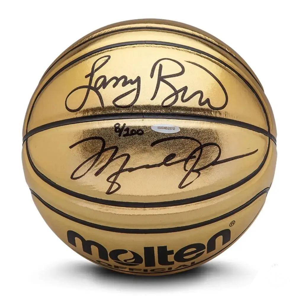 Molten gold basketball has been hand-signed by Michael Jordan (Chicago Bulls, HOF) and Larry Bird (Boston Celtics, HOF). Please note, this item is limited edition and has been numbered #/100.