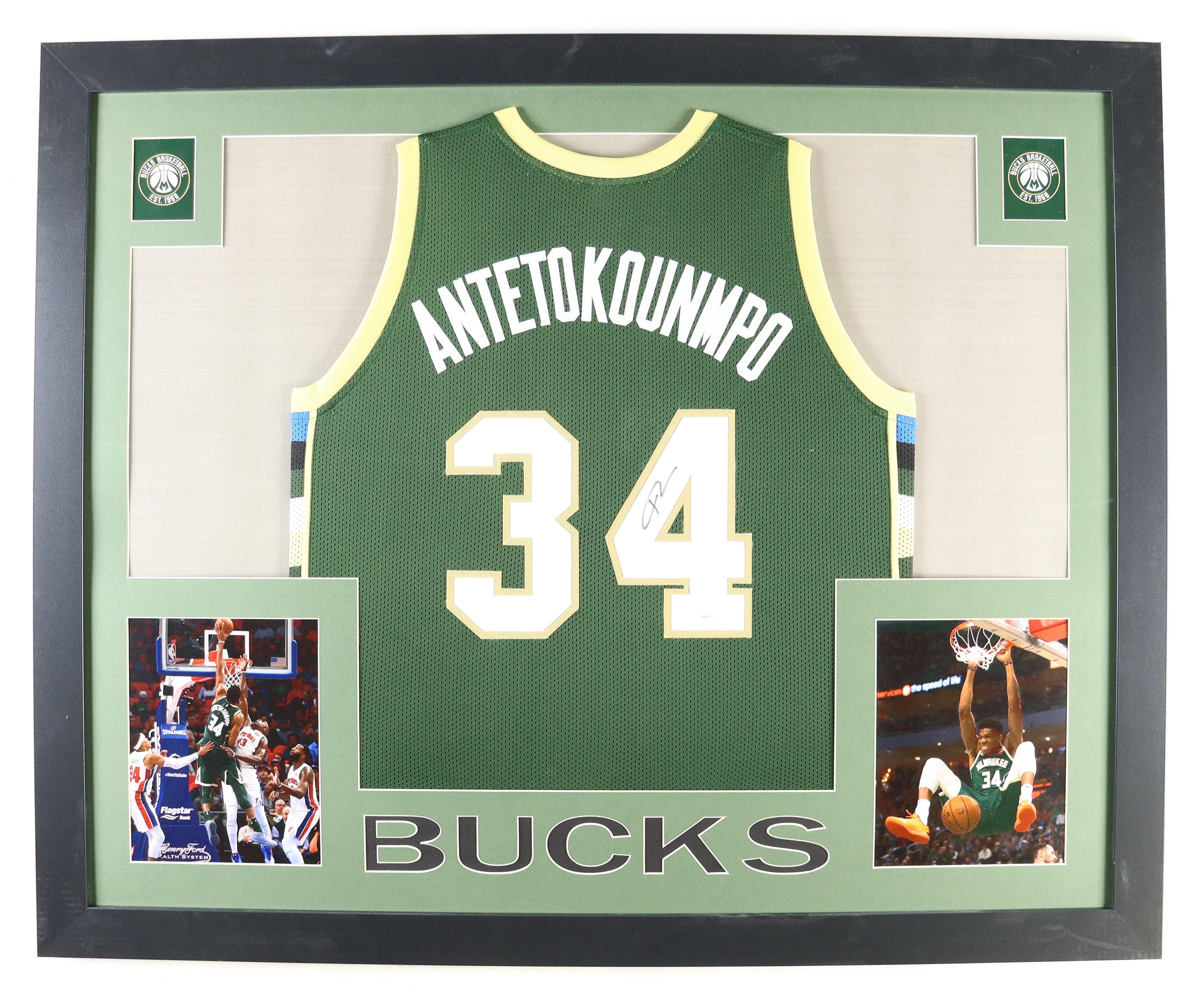 Custom frame measures approximately 35" x 43" in size and features a jersey hand-signed by Giannis Antetokounmpo. Please note 8x10 photos may be opposite.