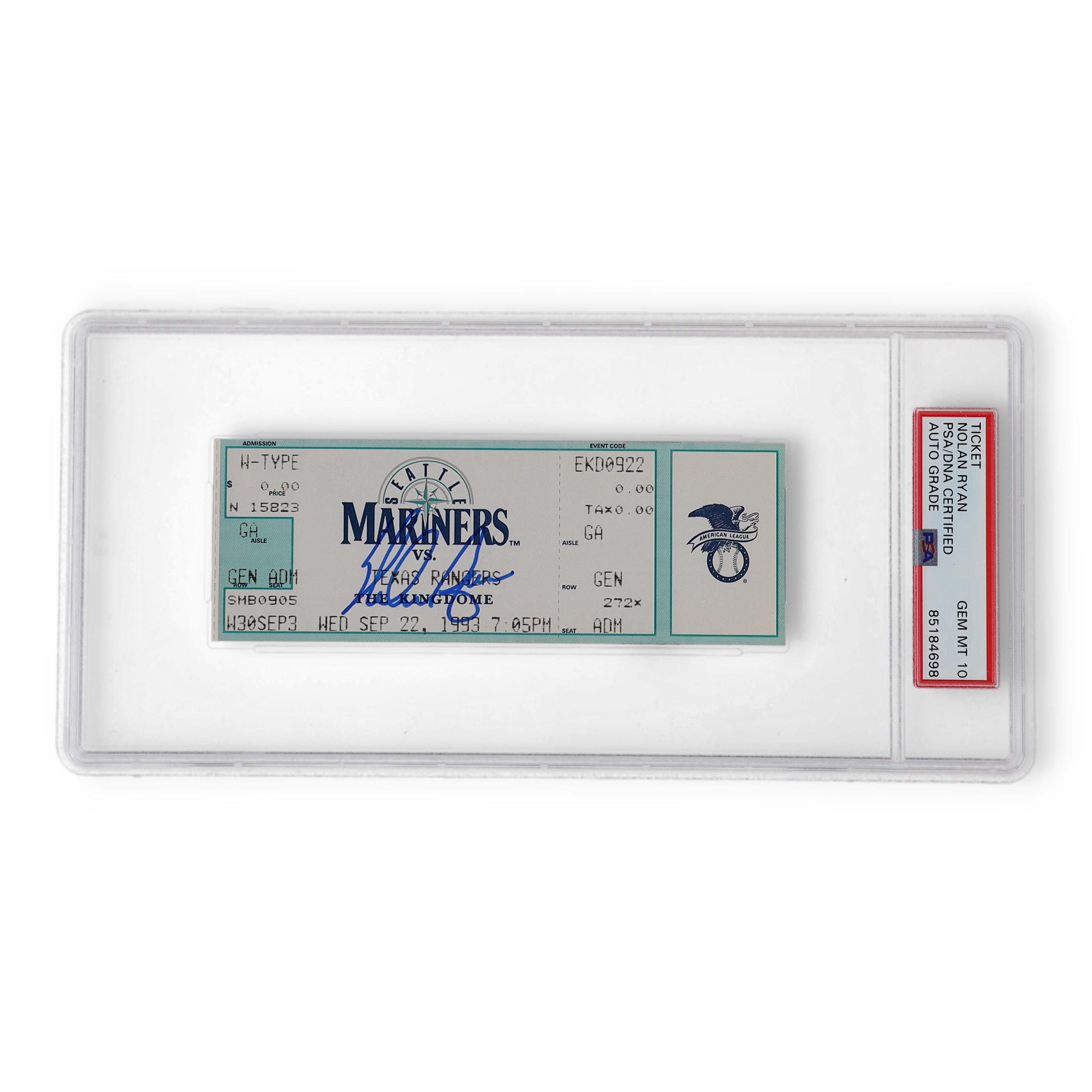 Ticket stub is dated September 22, 1993. Hand-signed by Nolan Ryan (Houston Astros, HOF).