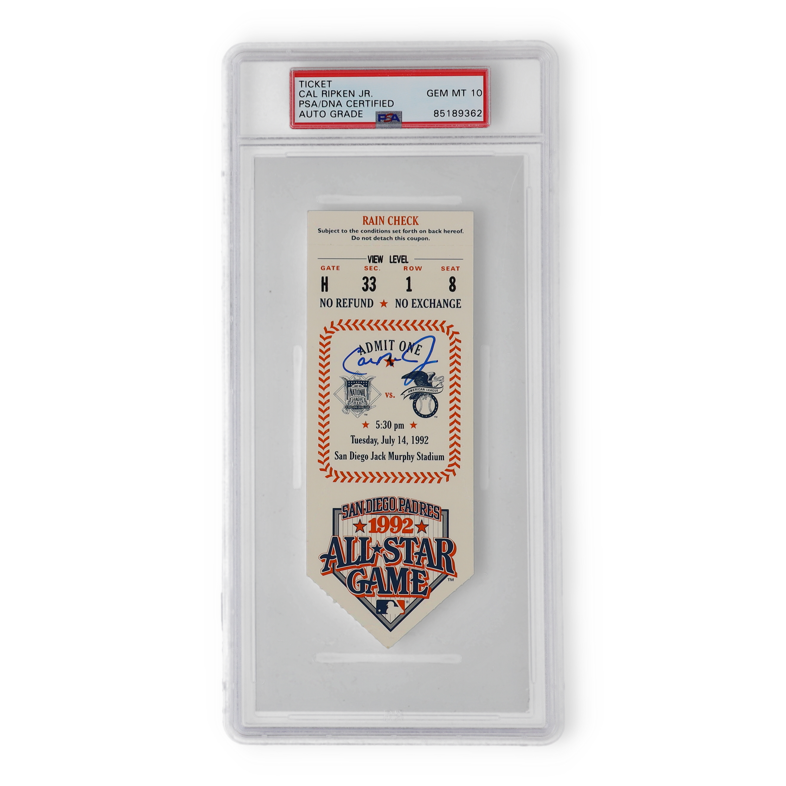 Cal Ripken Jr. Signed 1992 All-Star Game Ticket (PSA)
