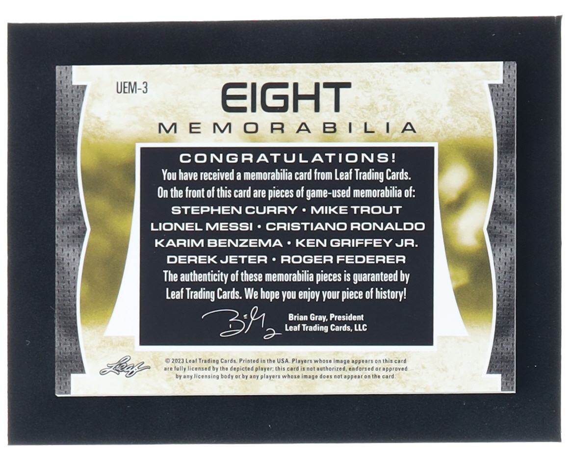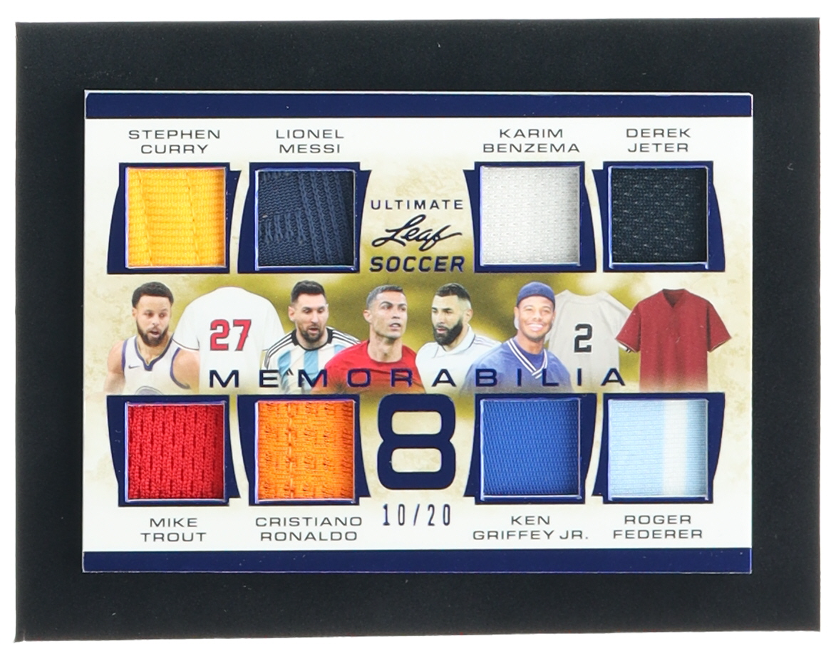 Stephen Curry / Lionel Messi / Karim Benzema / Derek Jeter / Mike Trout / Cristiano Ronaldo / Ken Griffey Jr. / Roger Federer 2023 Leaf Ultimate Soccer Memorabilia 8 Blue #UEM3 #10/20
