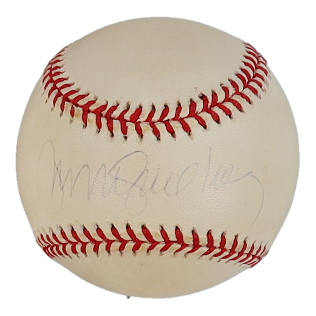 Rawlings Official National League Baseball. Hand-signed by Ryne Sandberg (Chicago Cubs, HOF). Please note, the baseball is naturally toned and the signature has faded.