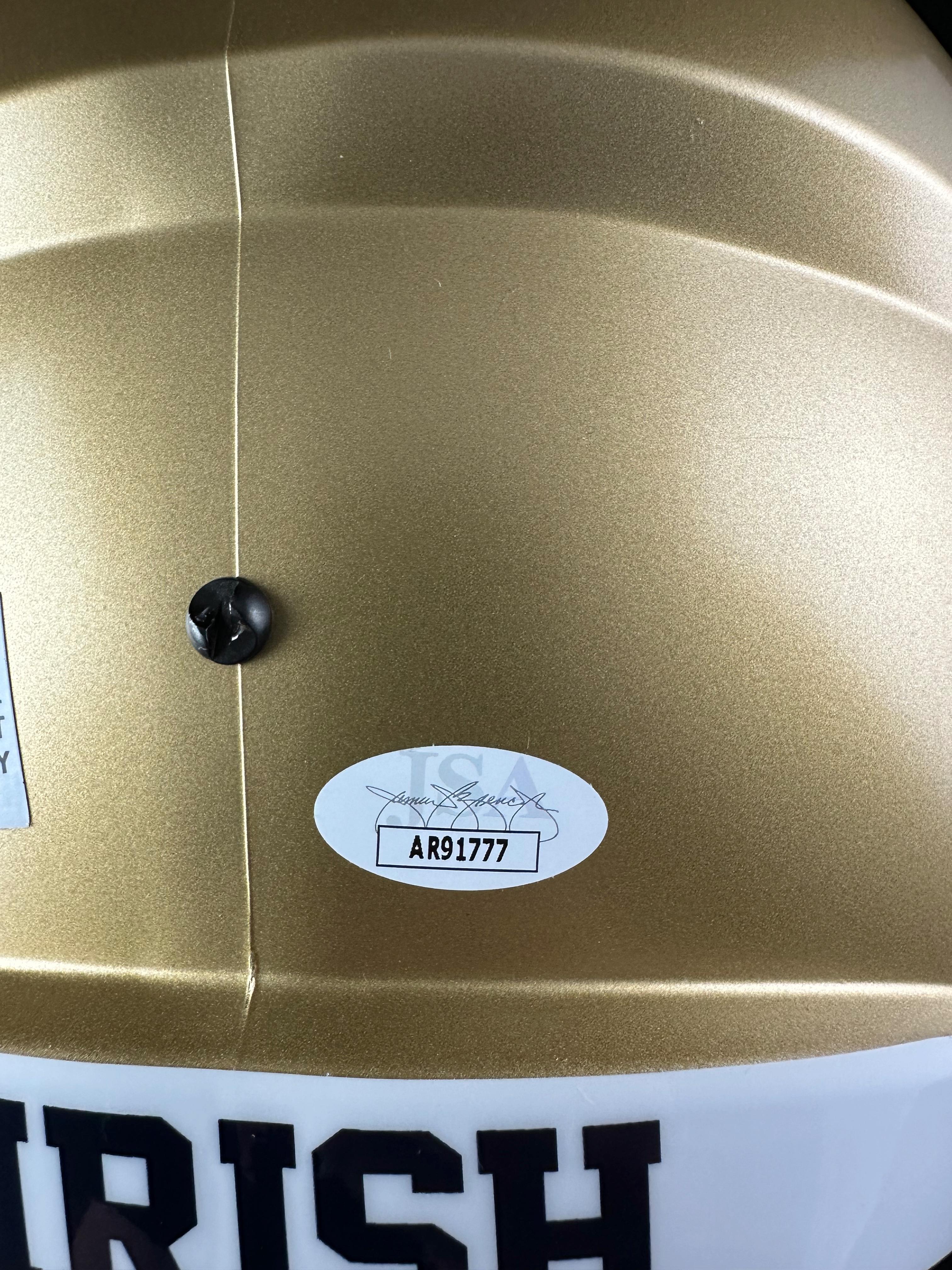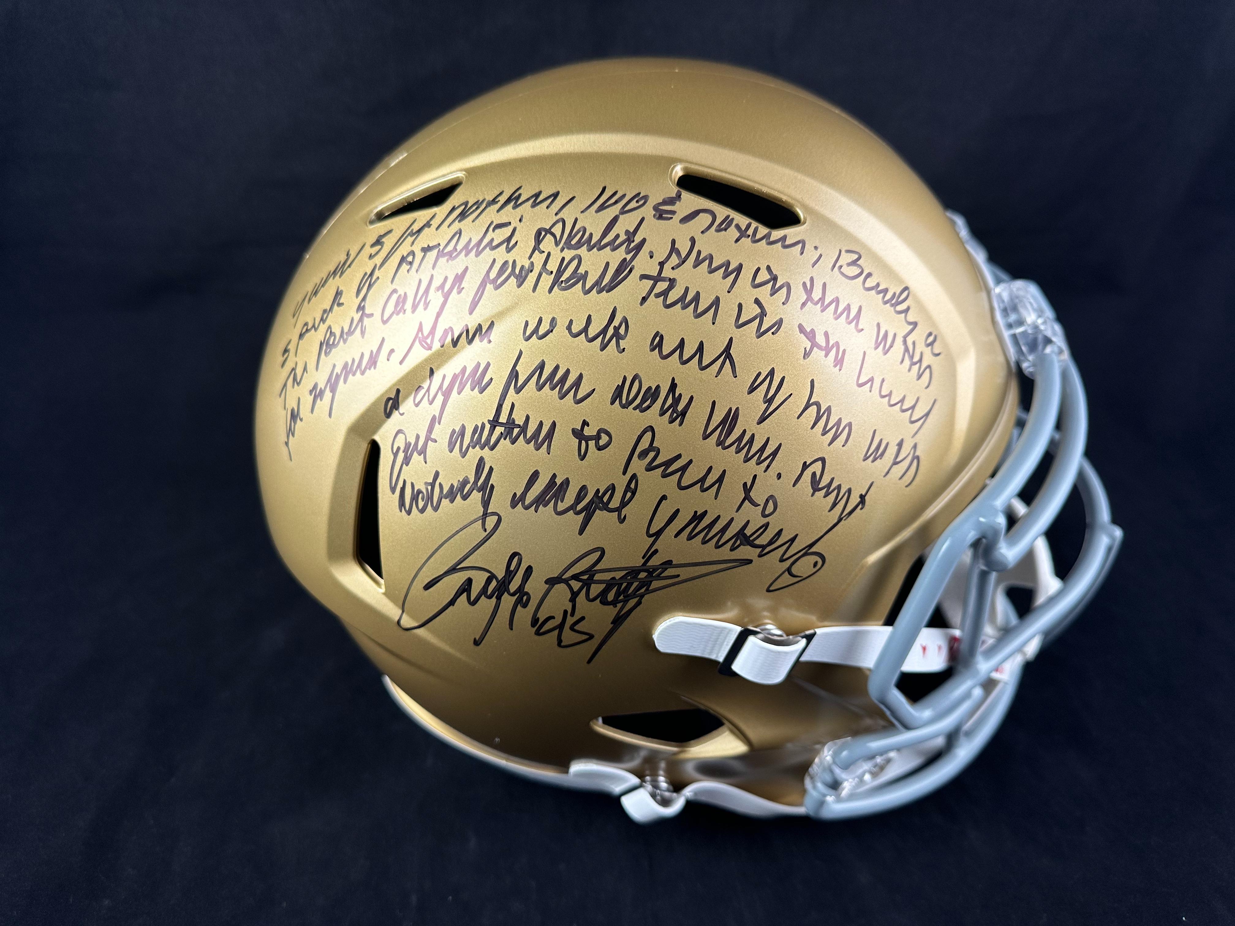 Riddell Notre Dame Fighting Irish full-size replica speed helmet has been hand-signed and inscribed by Rudy Ruettiger.