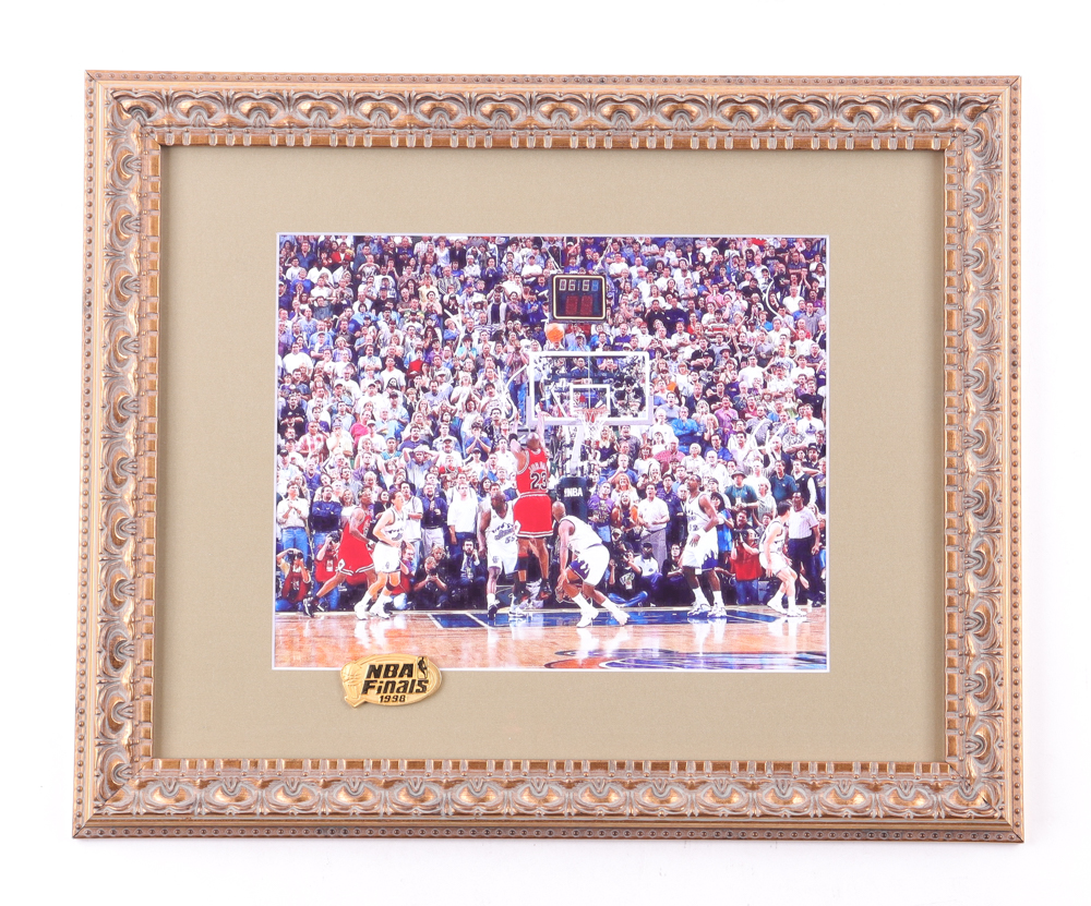 Custom frame measures approximately 13.25" x 16.25" in size. Features an unsigned photo of Michael Jordan (Chicago Bulls, HOF) "The Last Shot". Display also features a 1998 NBA Finals gold pin. Please note, the display is unsigned.