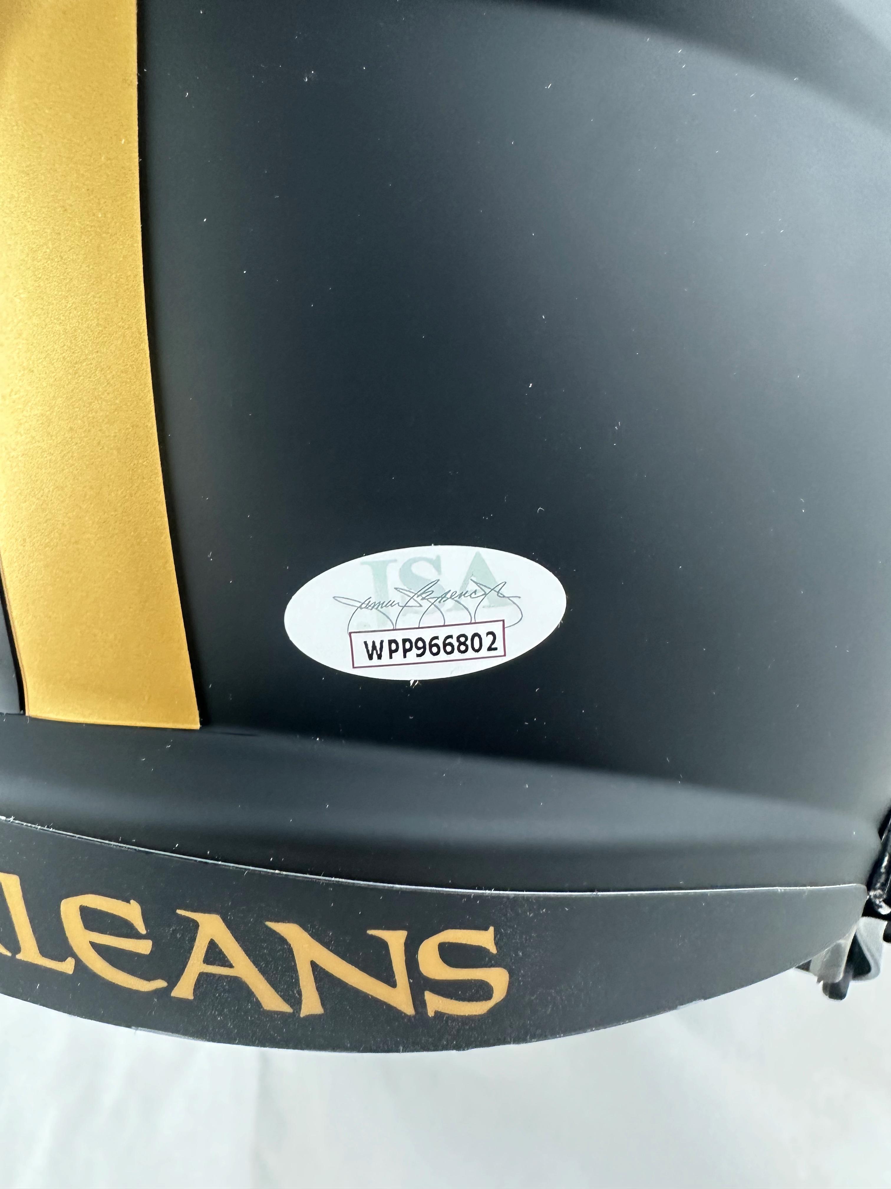Riddell New Orleans Saints Full-Size Eclipse Alternate speed replica helmet has been hand-signed and inscribed by Ricky Williams.