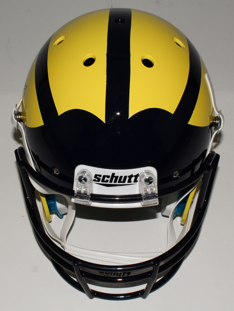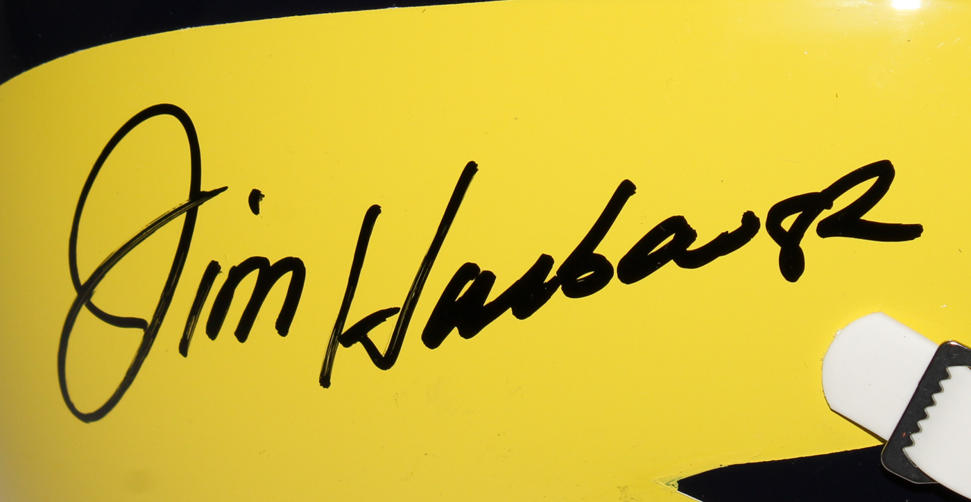 Schutt custom matte yellow full-size replica helmet has been hand-signed in black felt-tip pen by Jim Harbaugh (Bears).