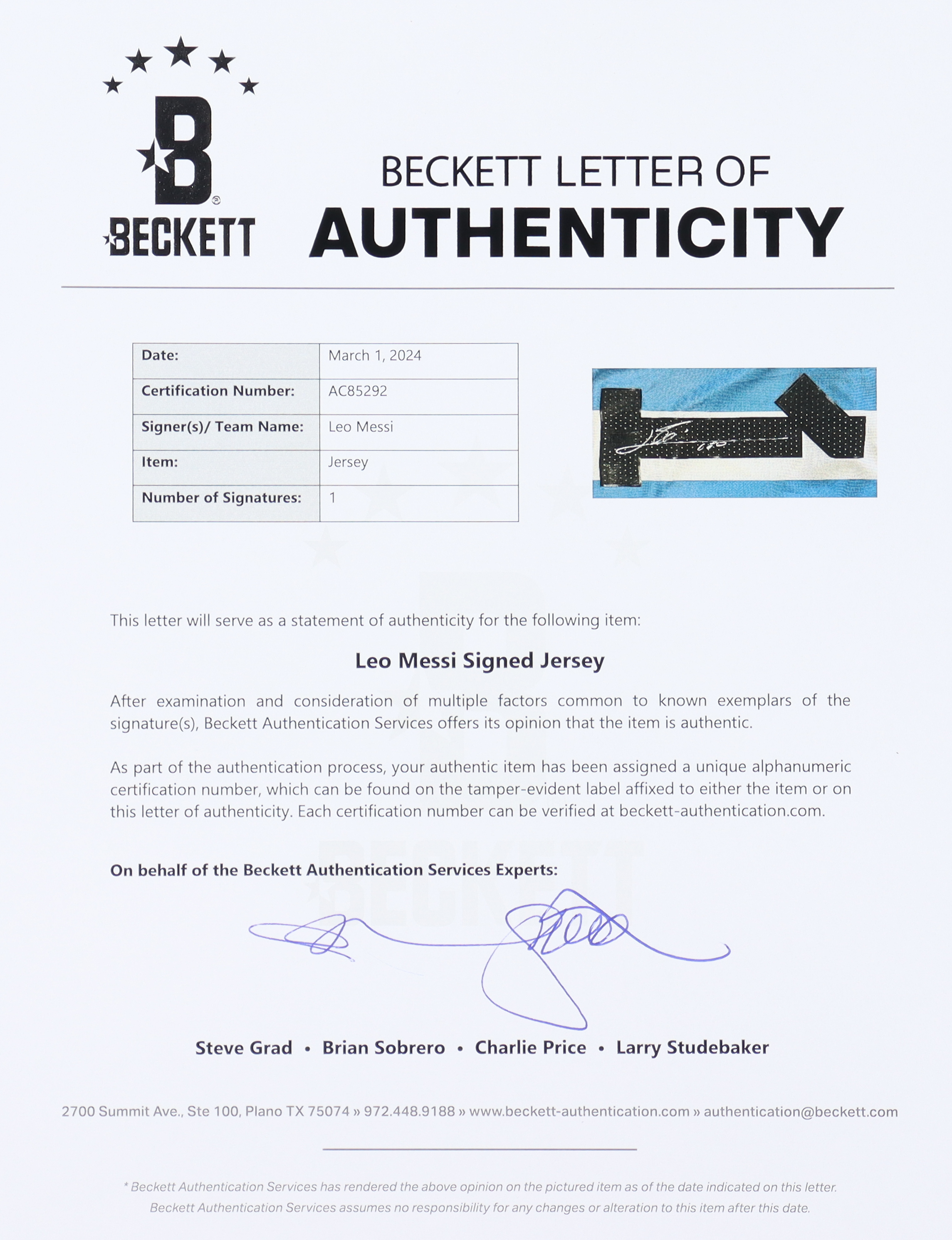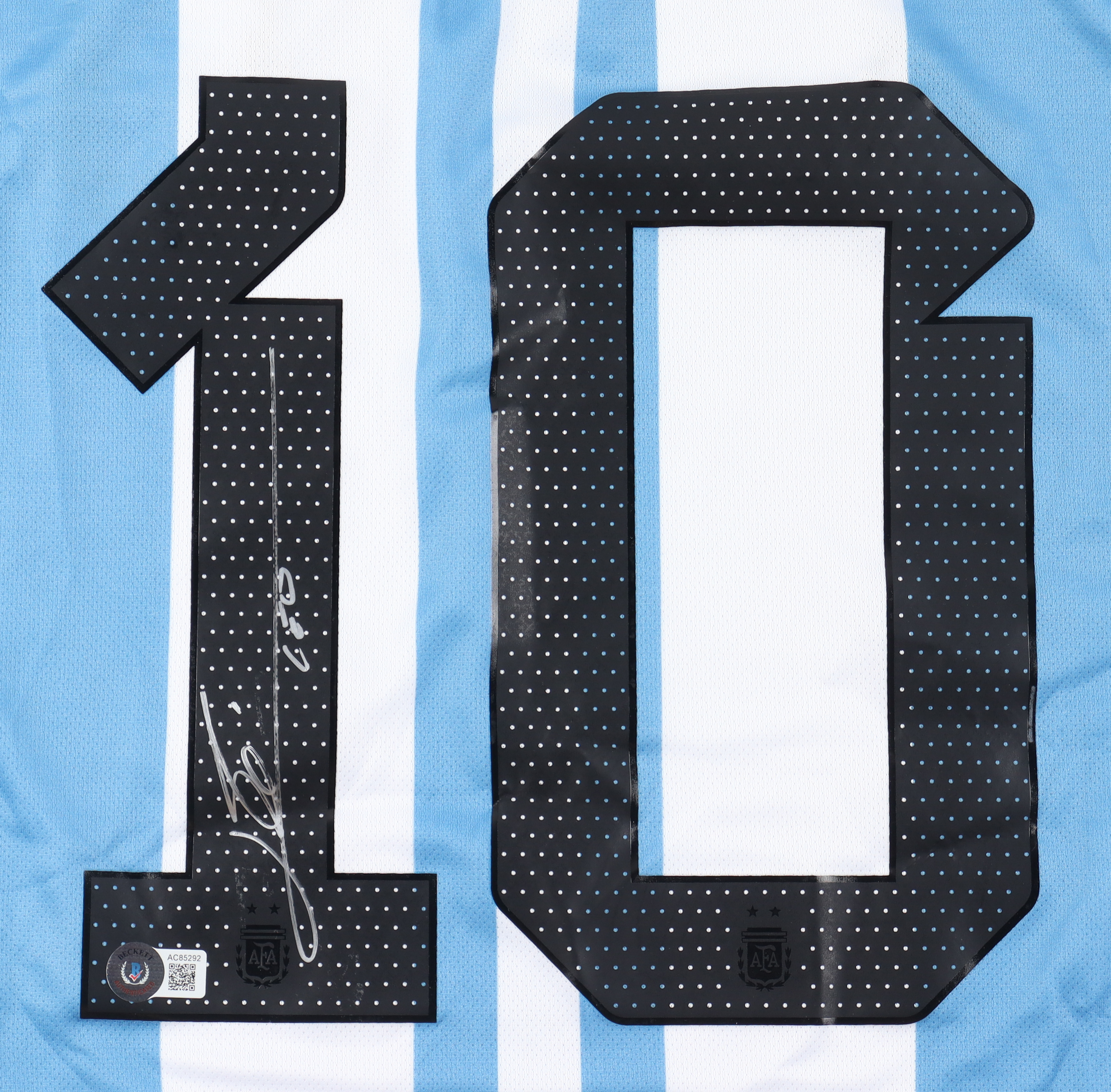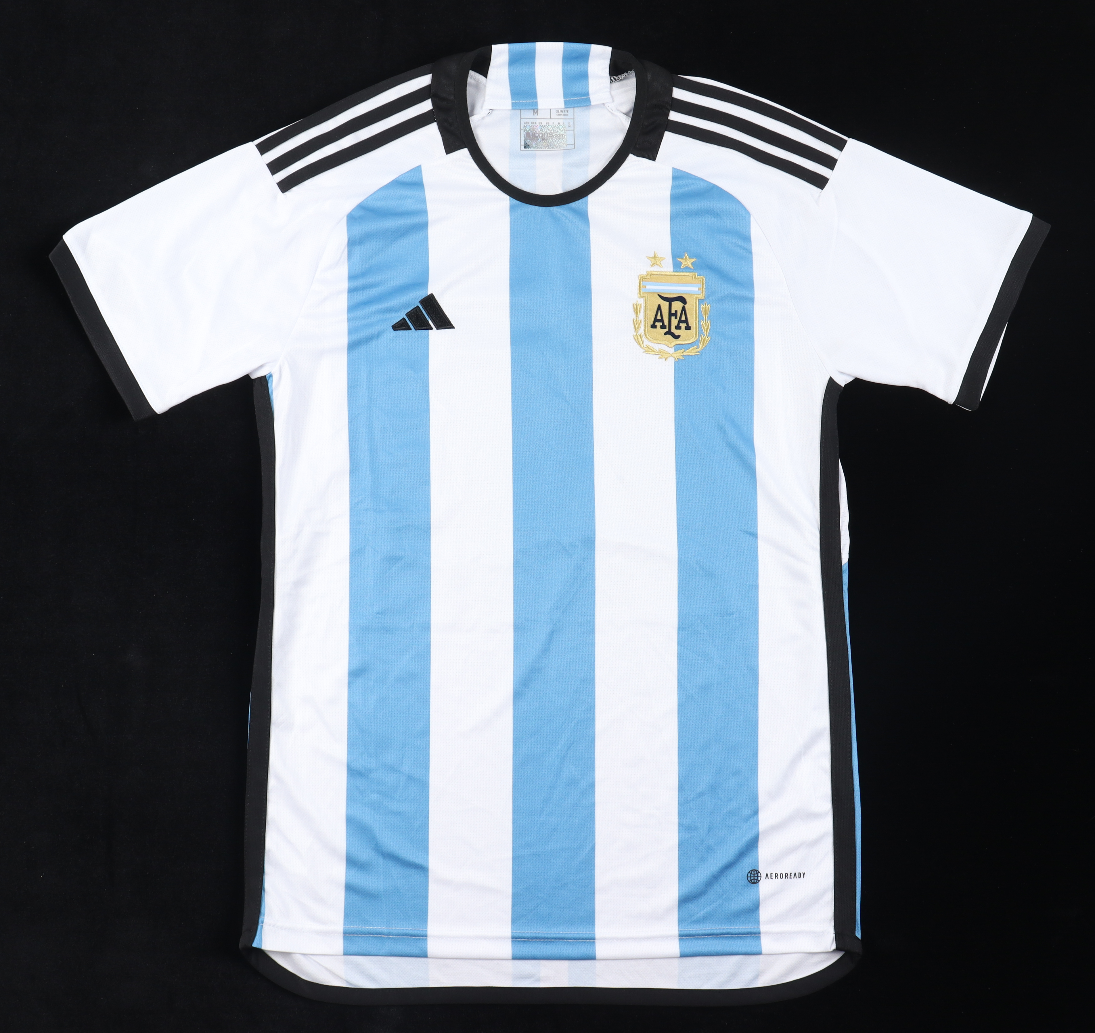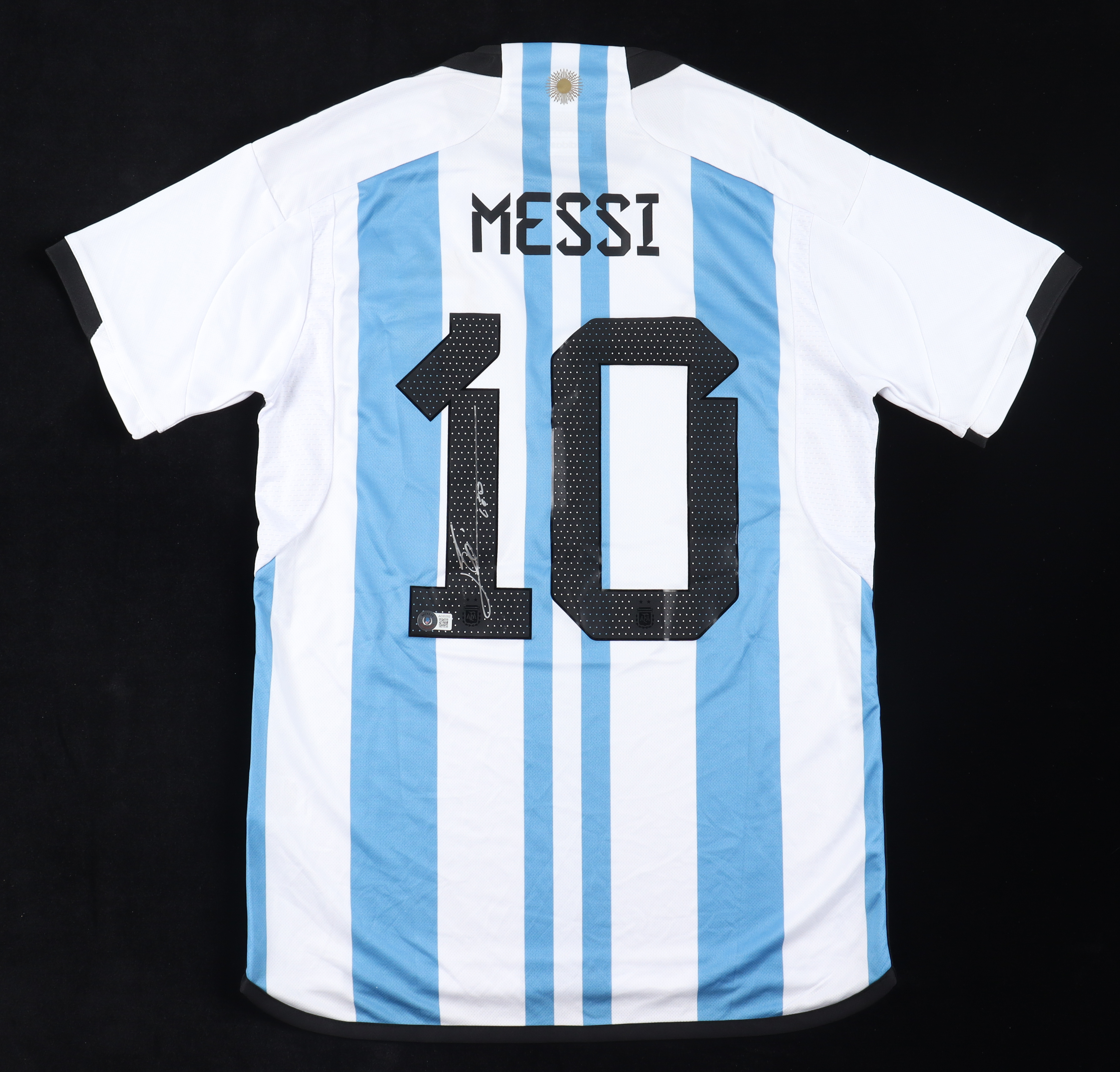 Adidas jersey with everything printed on, size M. Hand-signed and inscribed by Lionel Messi (Team Argentina).