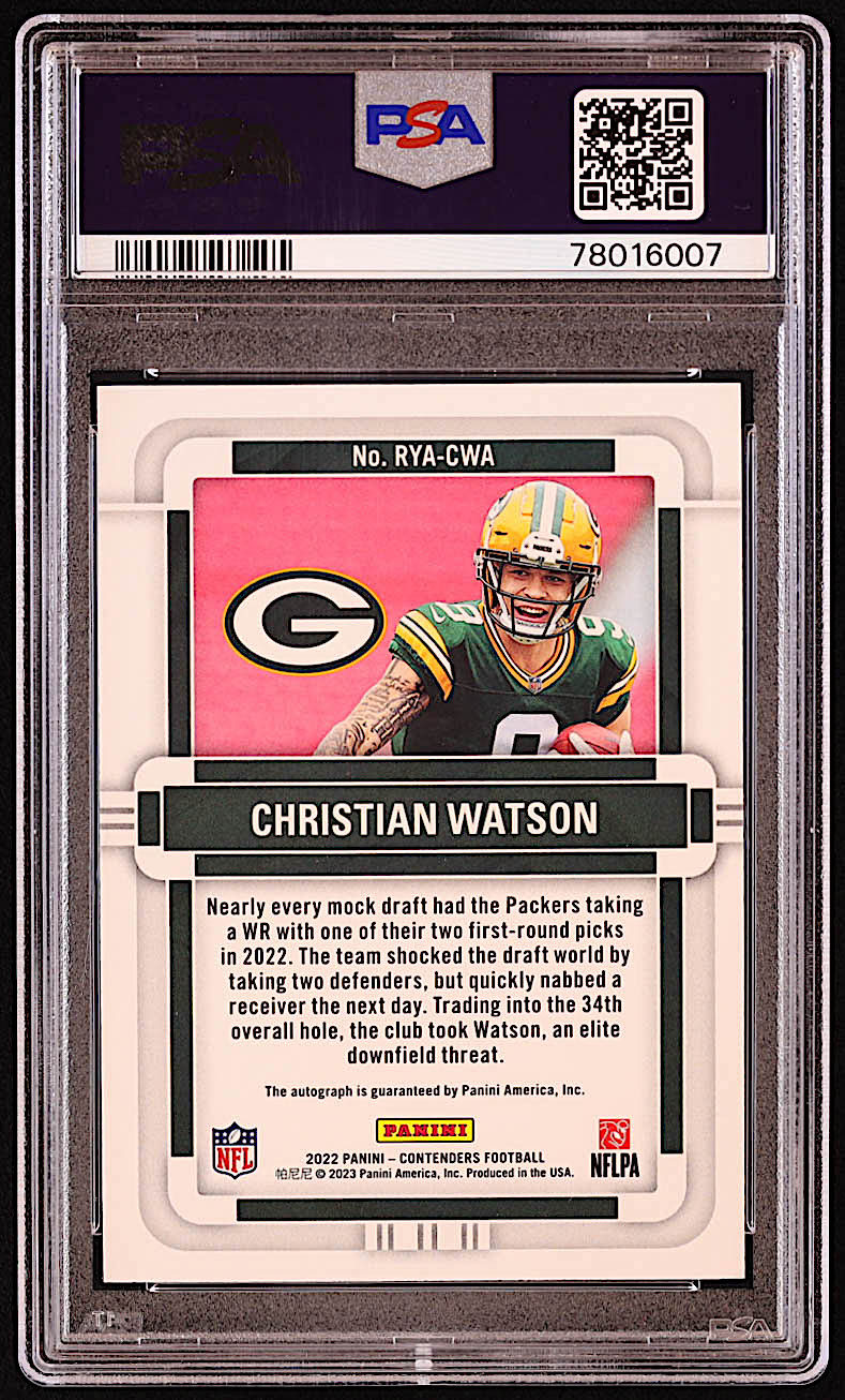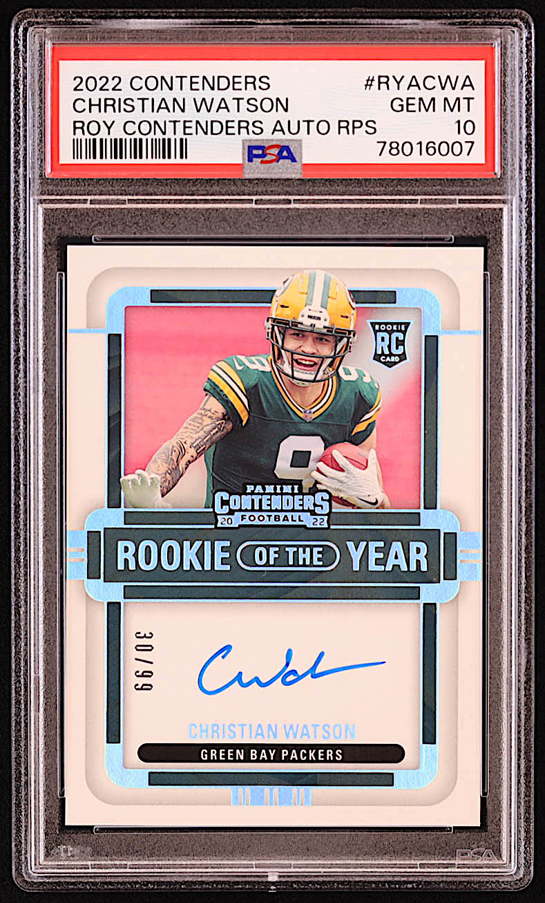 Christian Watson 2022 Panini Contenders Rookie of the Year Contenders Autographs #12 RC #30/99 (PSA 10)