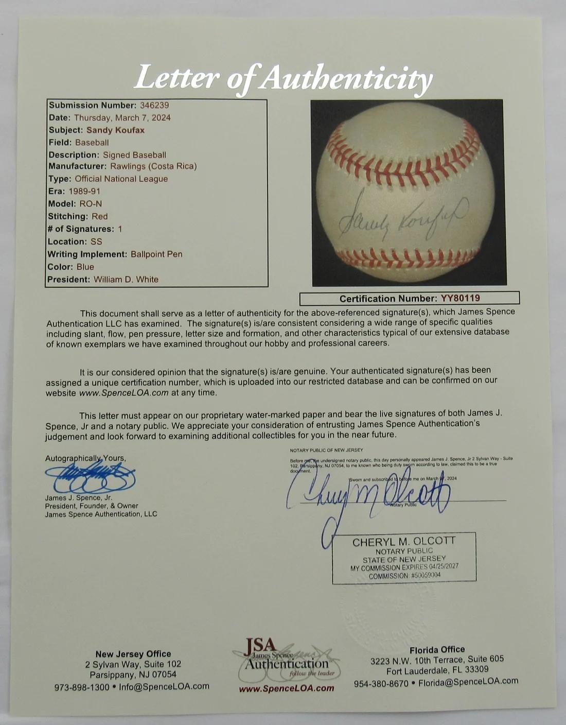 Rawlings Official National League baseball. Hand-signed by Sandy Koufax (Brooklyn / Los Angeles Dodgers, HOF). Please see photos for detail regarding condition of the baseball.