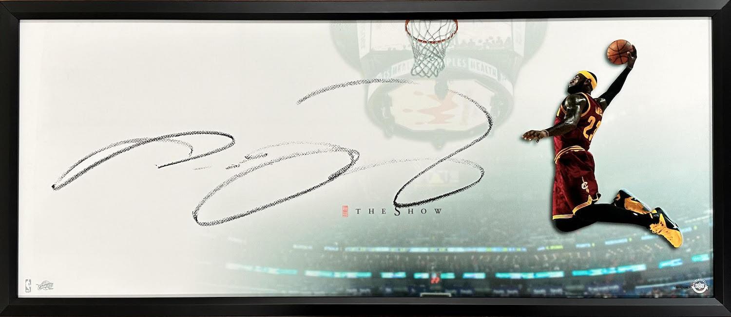 Custom frame measures 20" x 46" in size and features a photo that has been hand-signed by LeBron James (Cleveland Cavaliers).