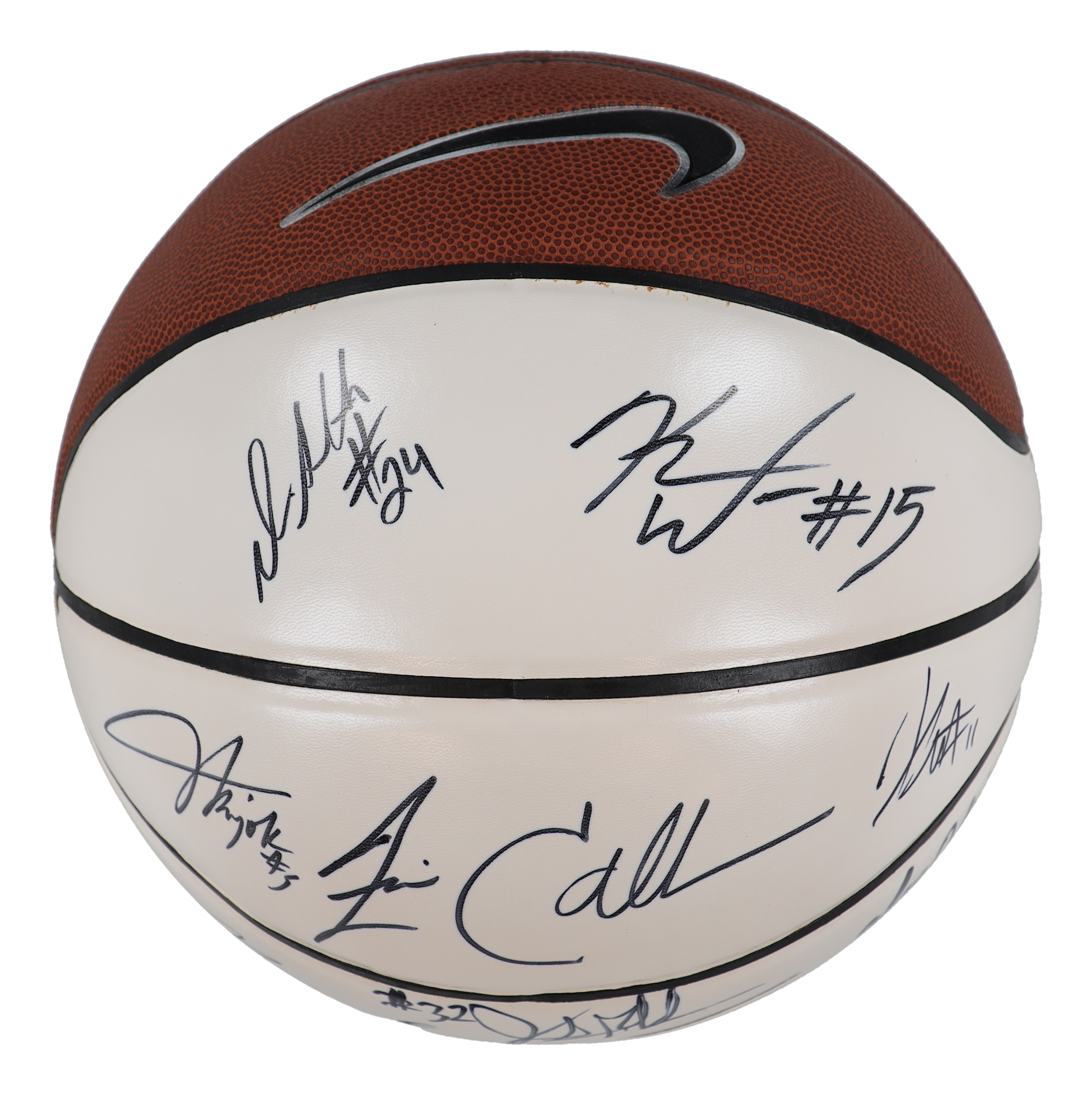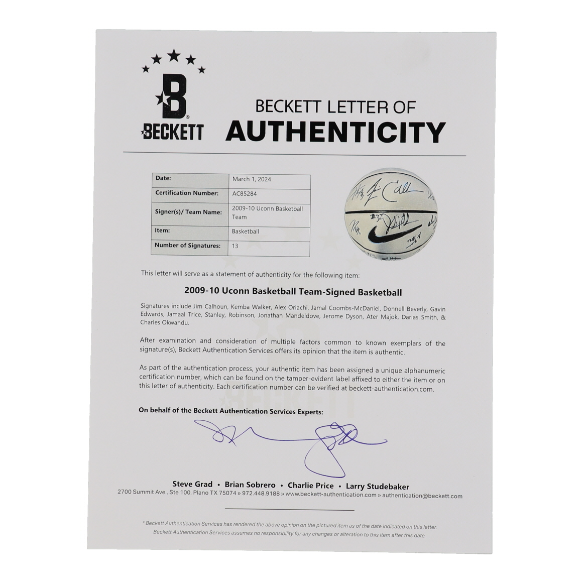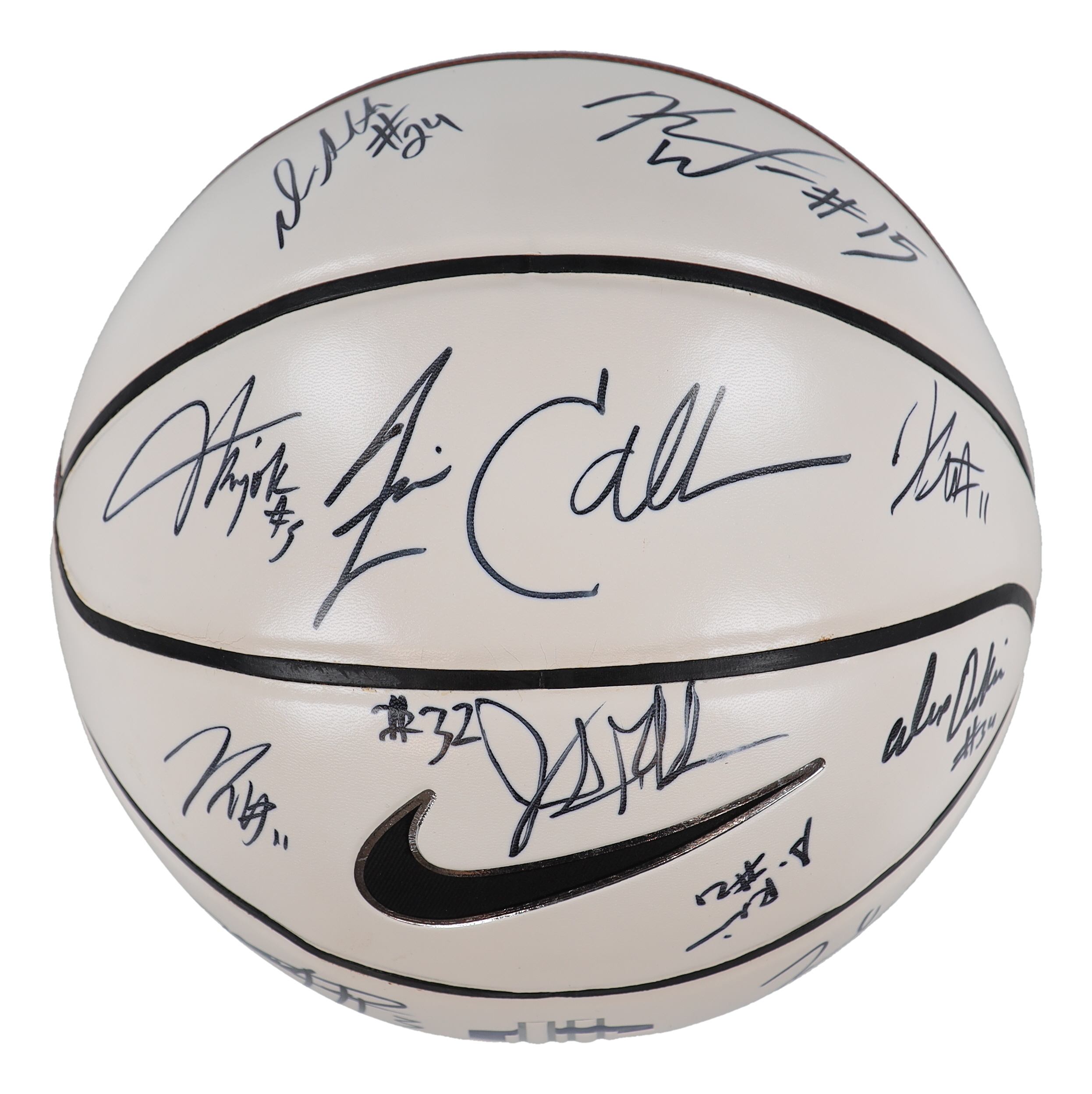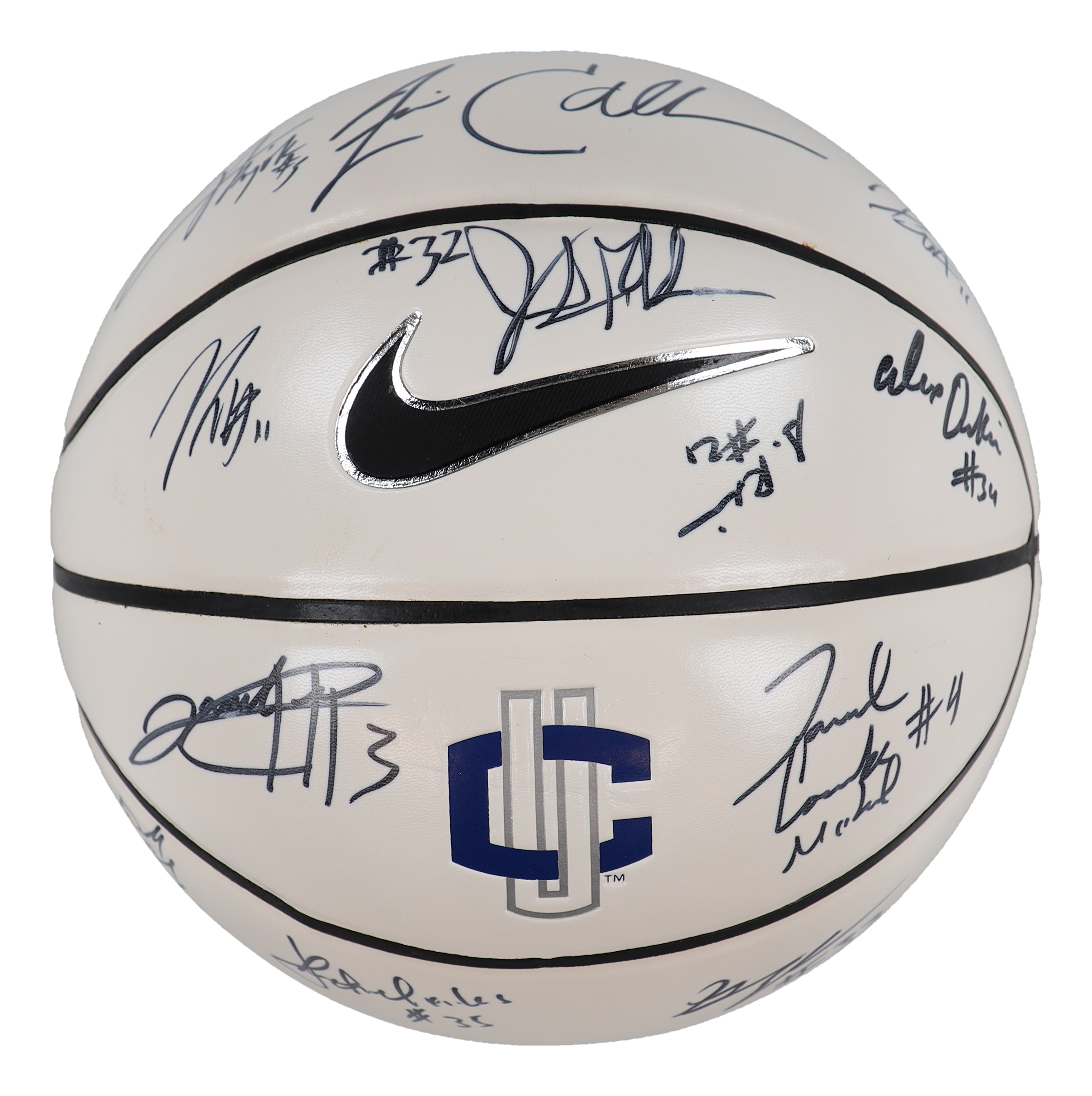 Nike UConn Huskies basketball has been hand-signed by (13) including Jim Calhoun, Kemba Walker, Alex Oriachi, Jamal Coombs-McDaniel, Donnell Beverly, Gavin Edwards, Jamaal Trice, Stanley Robinson, Jonathan Mandeldove, Jerome Dyson, Ater Majok, Darias Smith and Charles Okwandu.