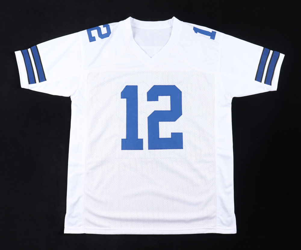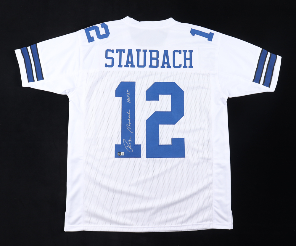 Custom jersey with everything sewn on, size XL. Hand-signed and inscribed by Roger Staubach (HOF).