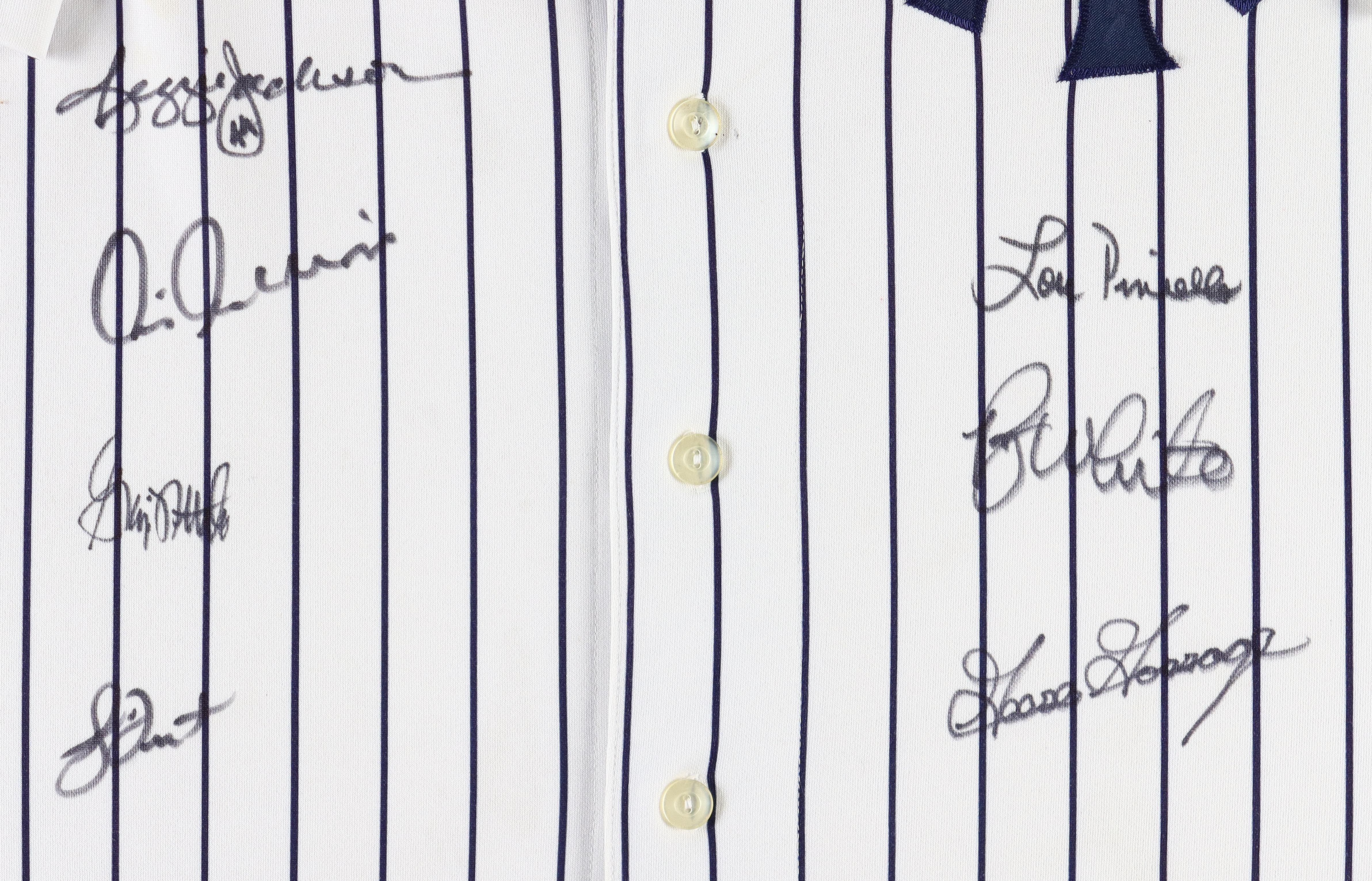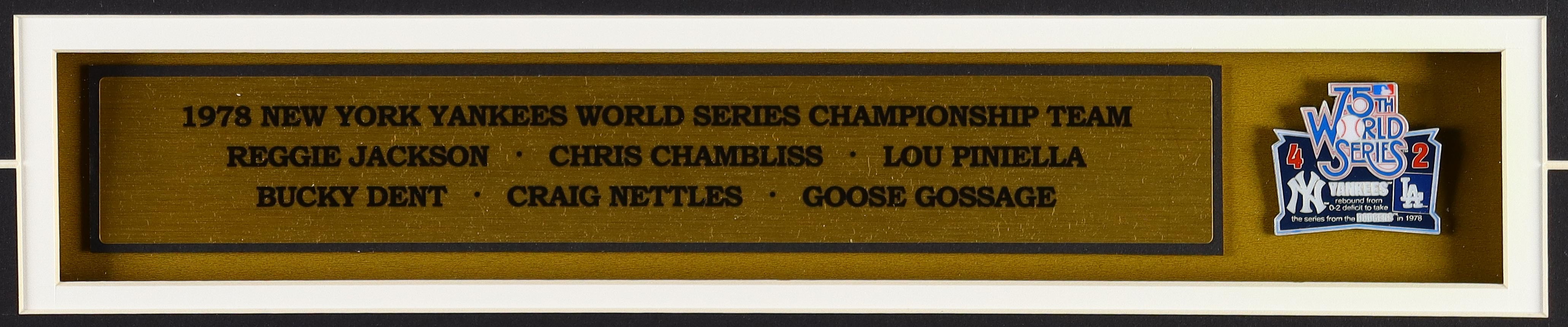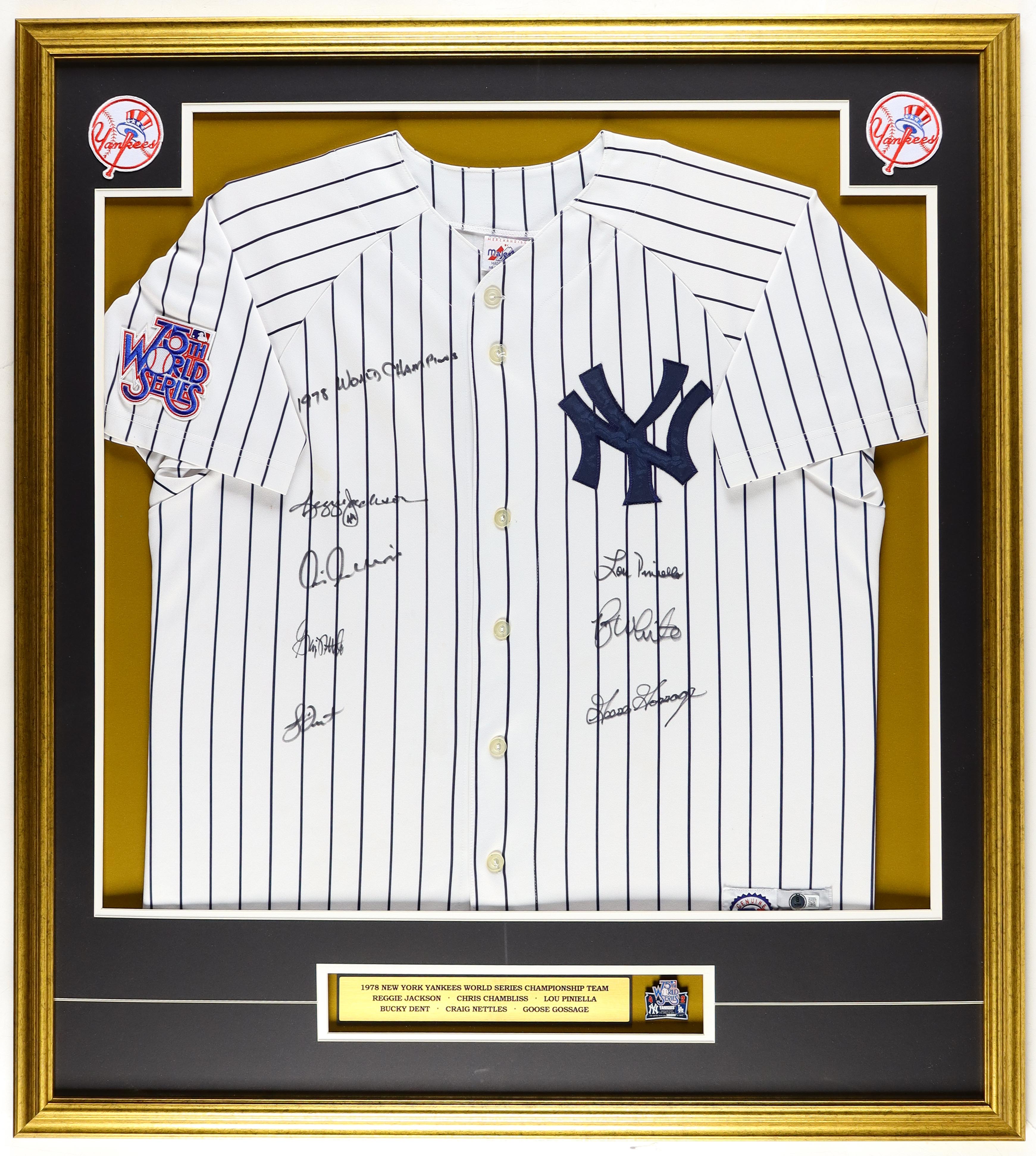Custom frame measures approximately 35" x 39" in size and features a jersey hand-signed by (7) members of the 1978 New York Yankees team. Signers include Reggie Jackson, Lou Piniella, Chris Chambliss, Graig Nettles, Ron White, Goose Gossage and Bucky Dent. Includes pin.