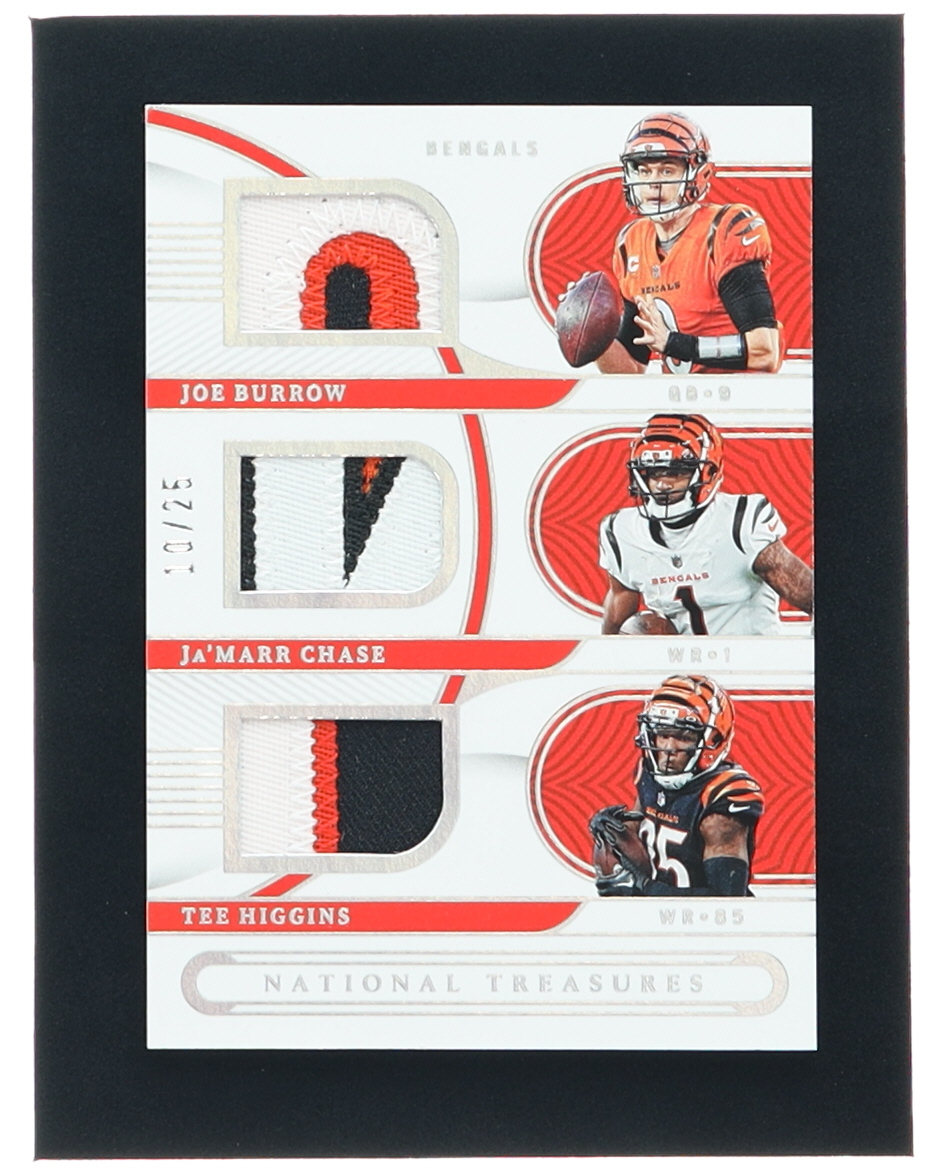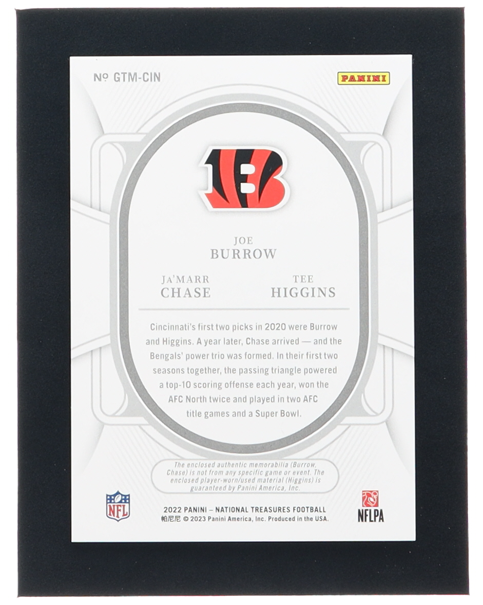 Joe Burrow / Ja'Marr Chase / Tee Higgins 2022 Panini National Treasures NFL Gear Trio Materials Holo Silver #2 #10/25