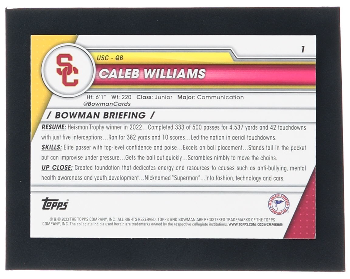 Caleb Williams 2023 Bowman Chrome University Shimmer Refractors #1 RC