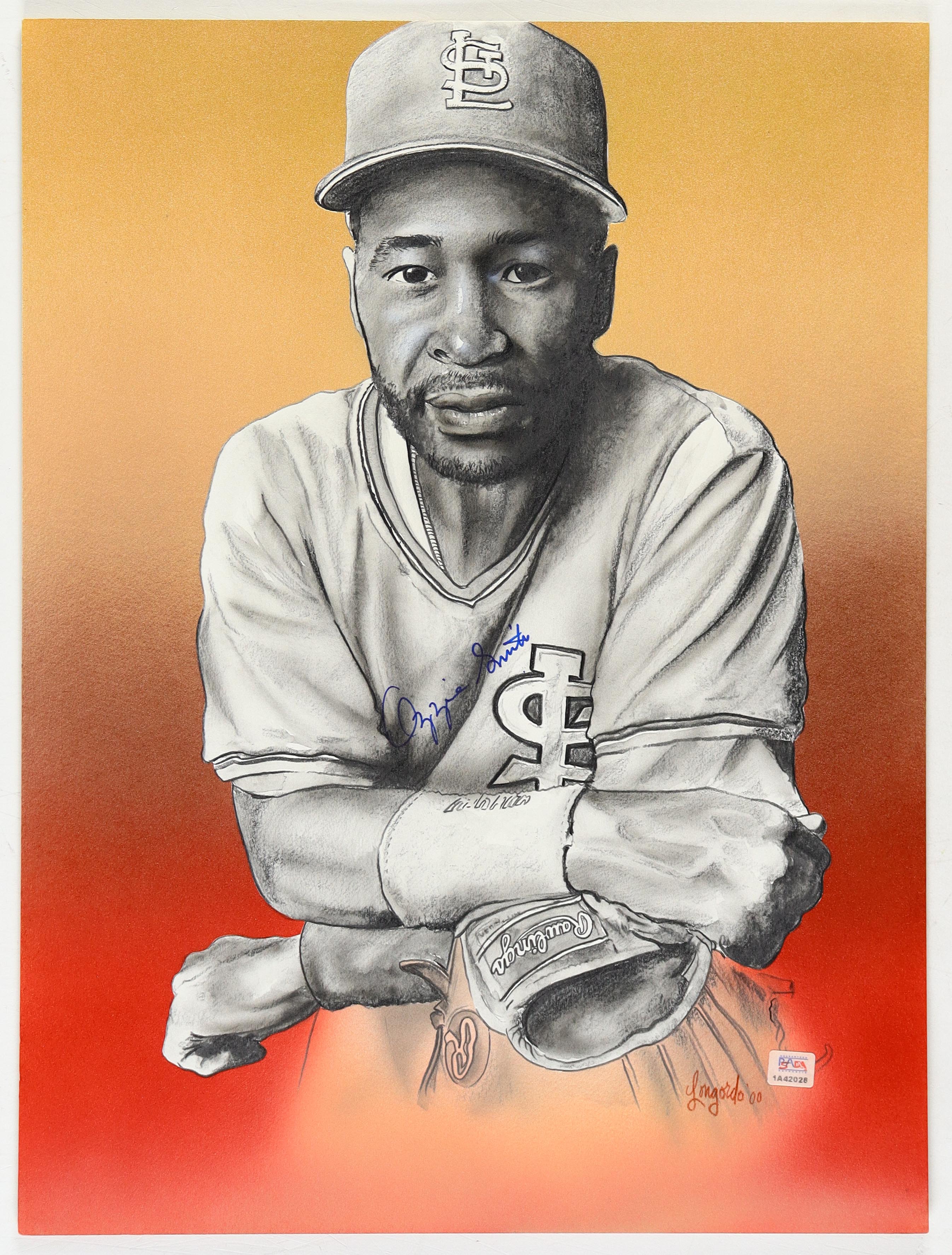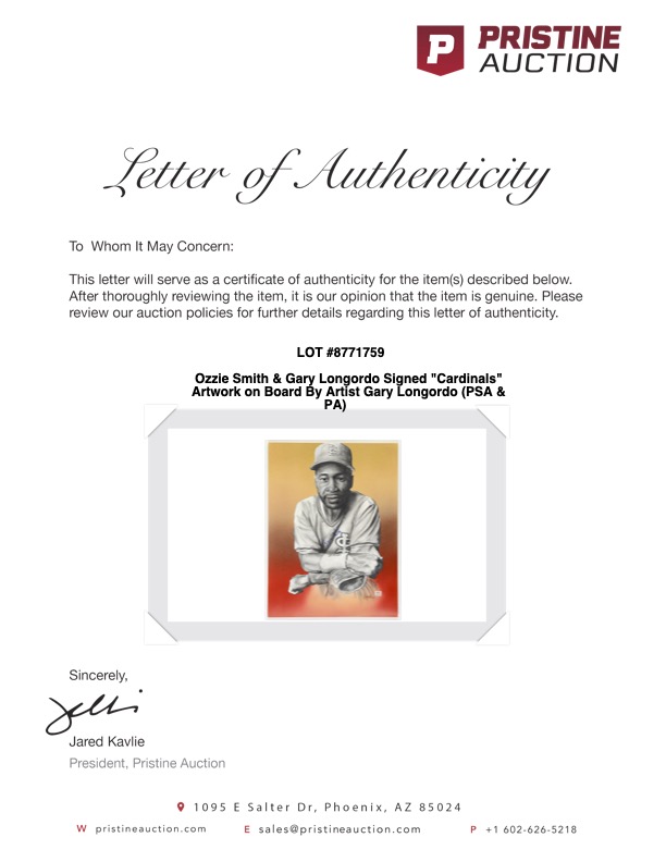 Artwork on illustration board measures approximately 15" x 20" in size. Hand-signed by Ozzie Smith (St. Louis Cardinals, HOF) and by the artist, Gary Longordo.