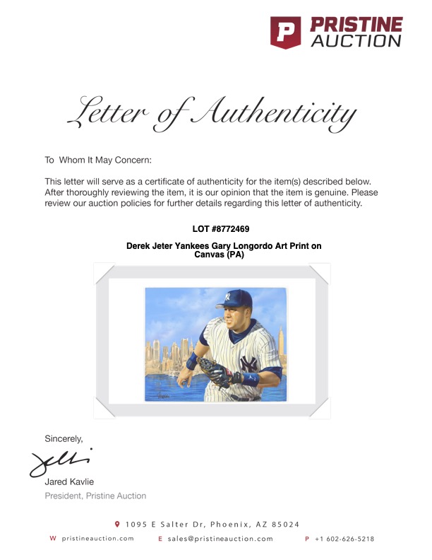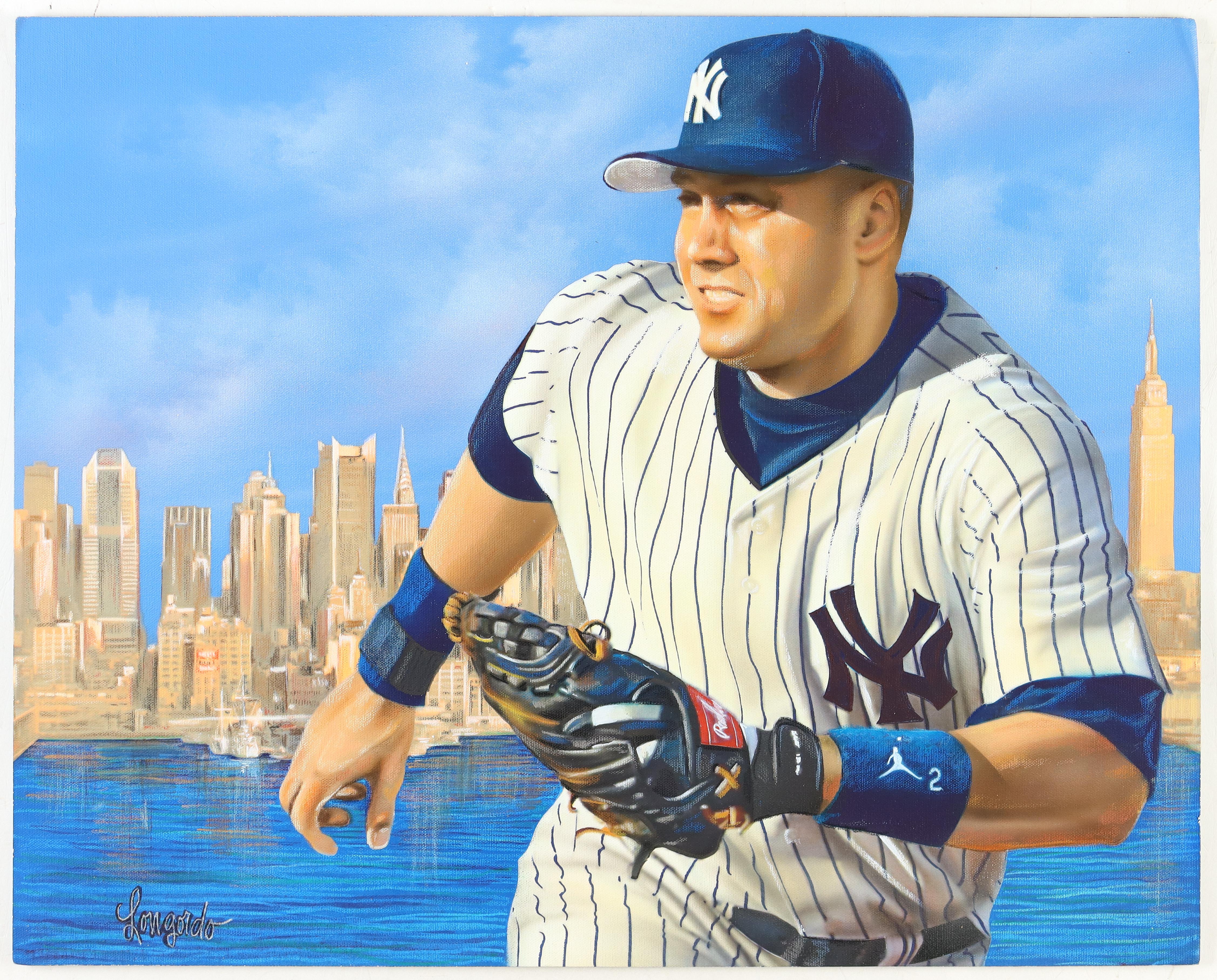 Canvas measures approximately 20" x 25" in size. The art print features Derek Jeter (New York Yankees, HOF). The canvas print has been signed by the artist, Gary Longordo.