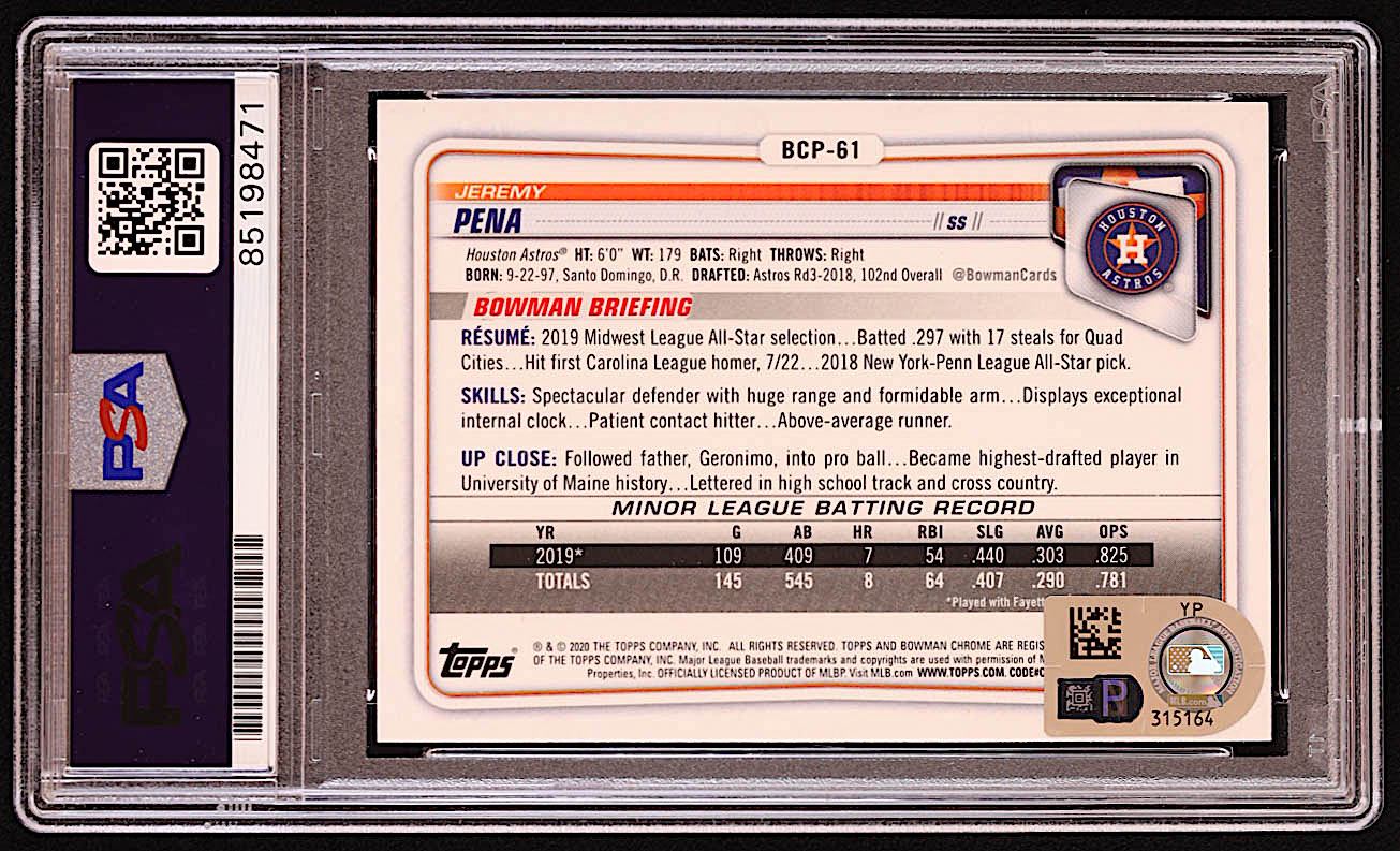 Jeremy Pena Signed 2020 Bowman Chrome Prospects #BCP61 RC (PSA & MLB)