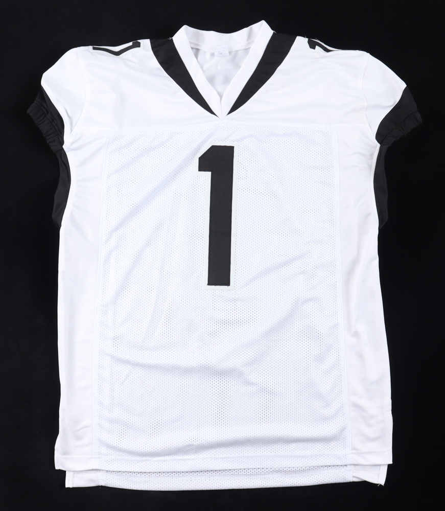 Custom jersey with everything sewn on, size XL. Hand-signed by Travis Etienne Jr. Please note, the jersey is stained.