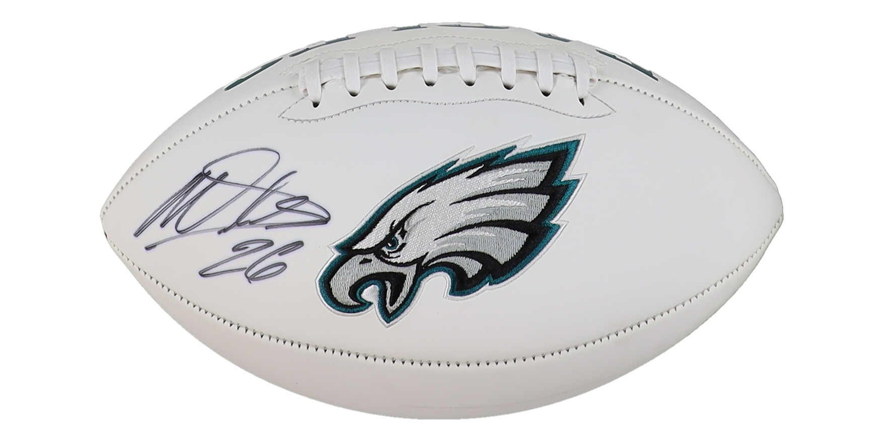 Philadelphia Eagles logo football has been hand-signed by Miles Sanders.