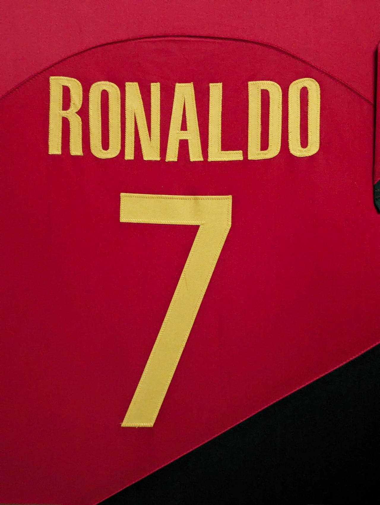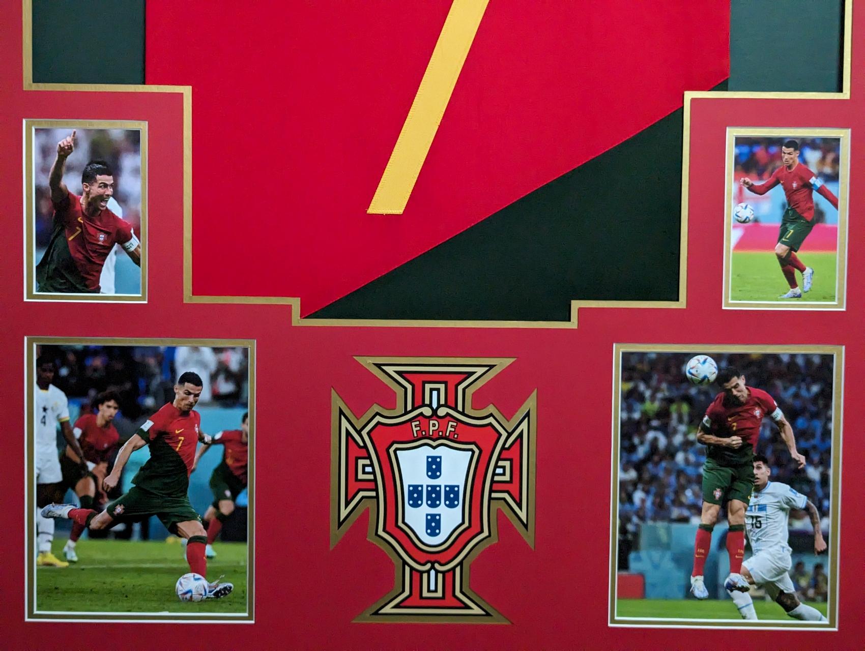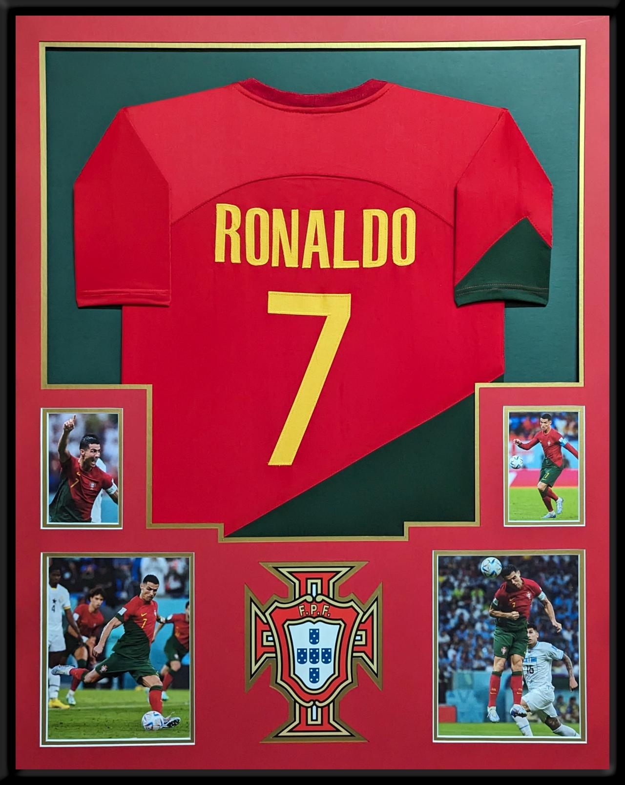 Custom framed display measures 34" x 42" in size and features a jersey of Cristiano Ronaldo. Please note, the jersey is unsigned.