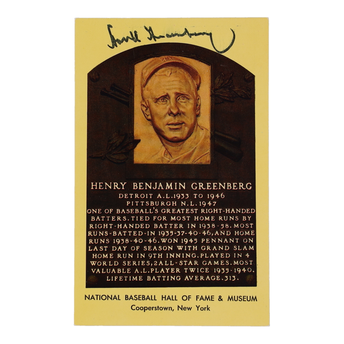 Hank Greenberg Signed Hall of Fame Plaque Postcard (JSA)