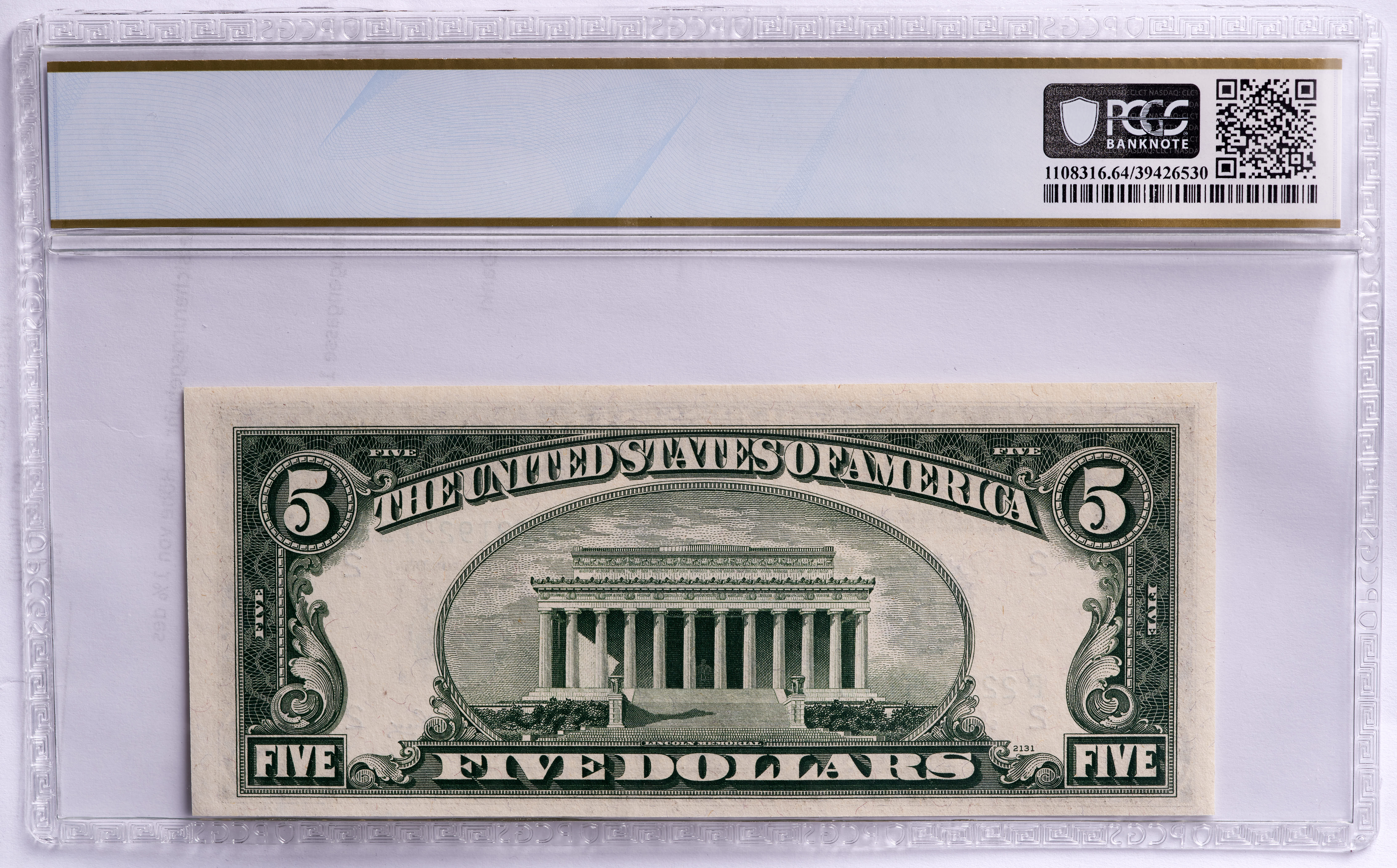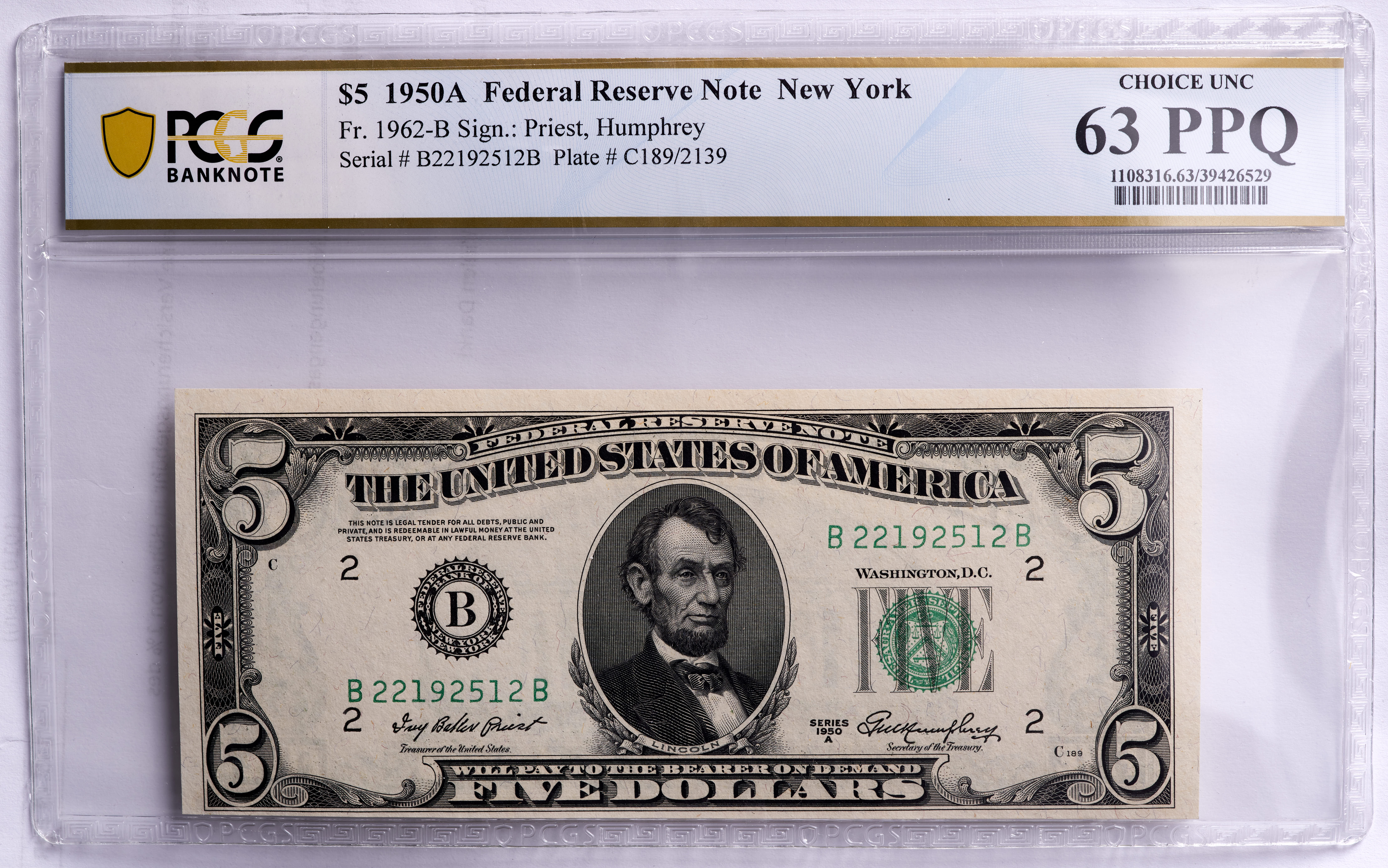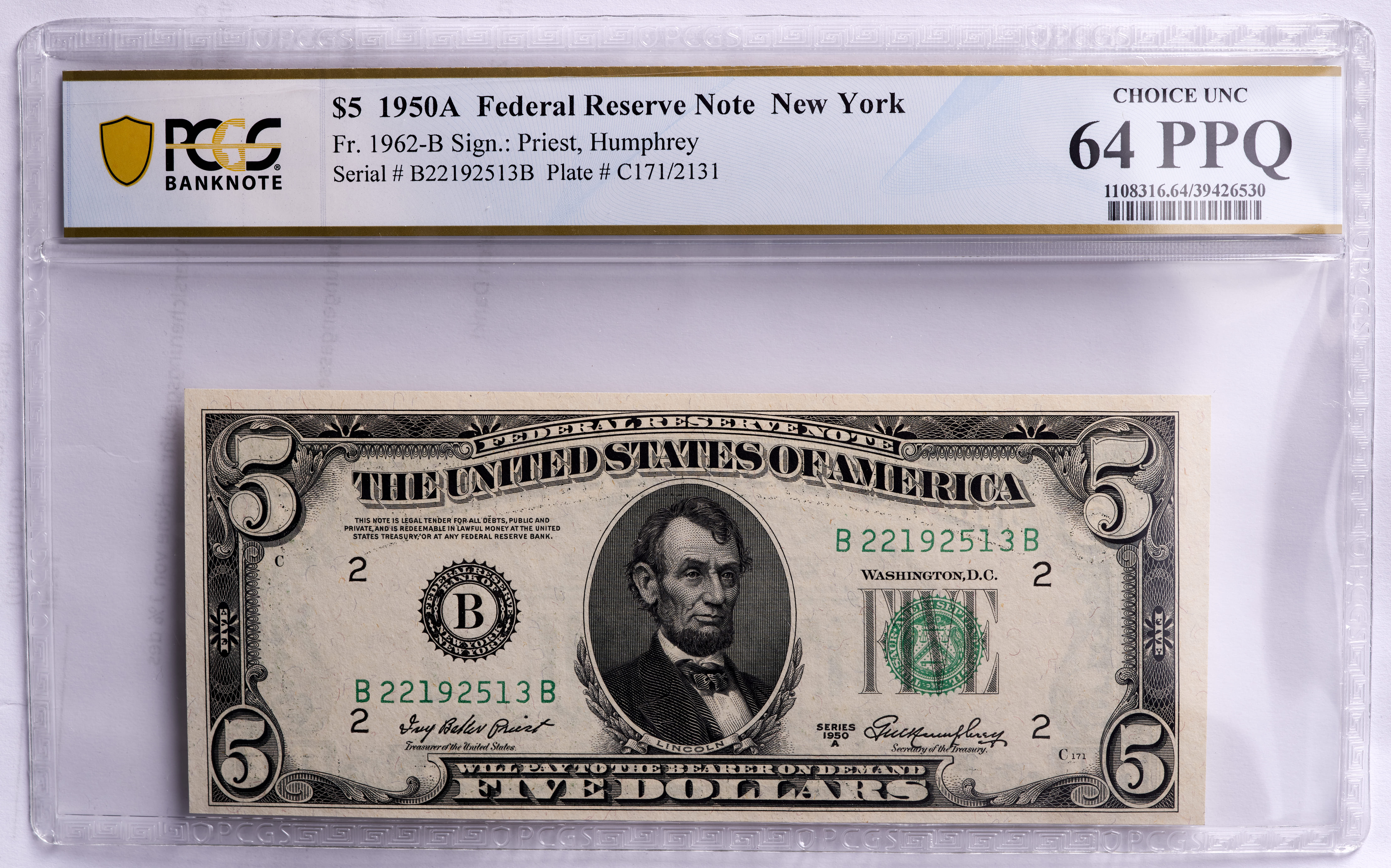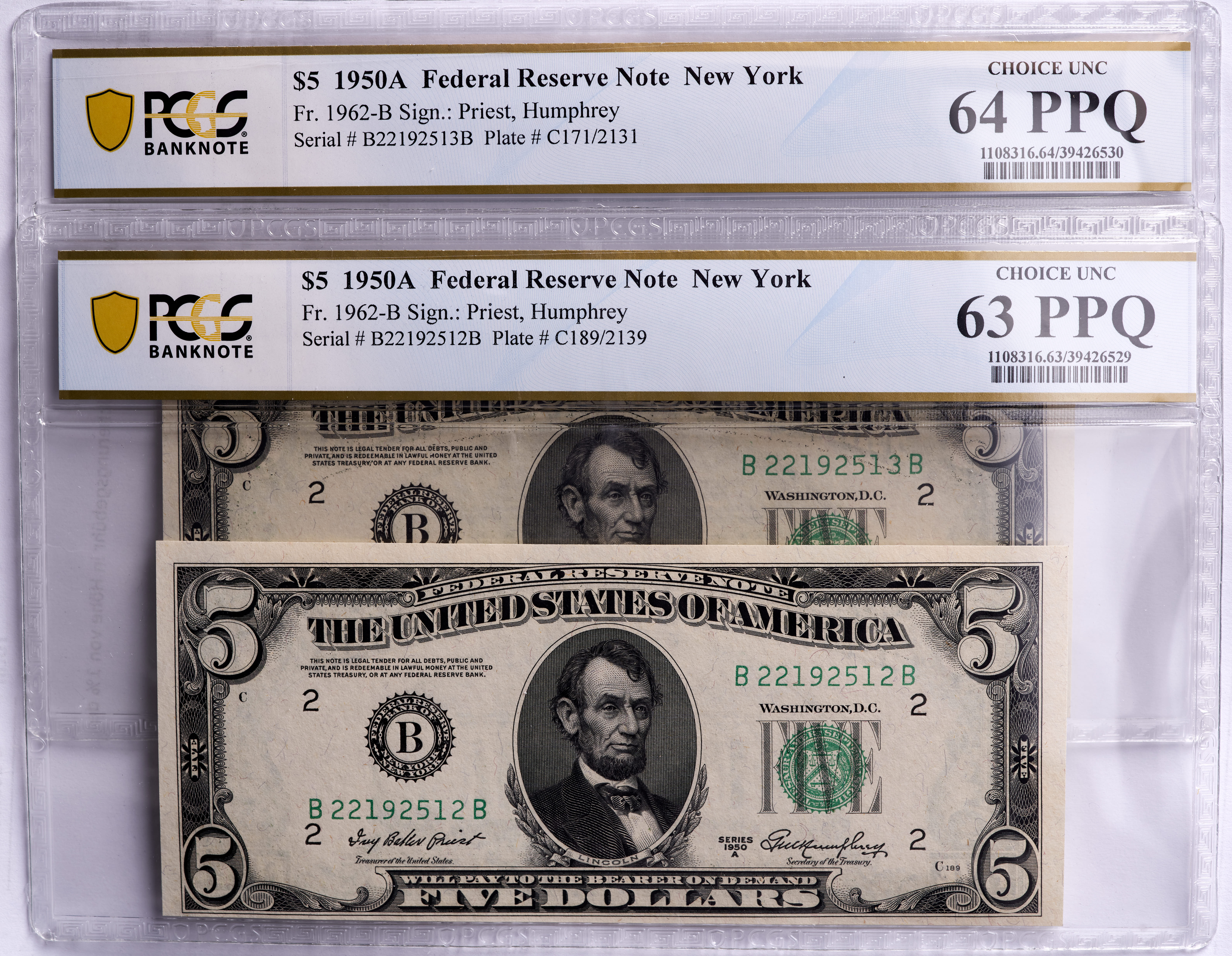 Sequential Set Of (2) Numbered 1962-B 1950A $5 New York Federal Reserve Bank Notes (PCGS Banknote Choice Unc 63 PPQ & Choice Unc 64 PPQ)